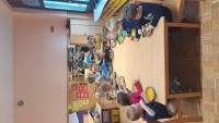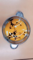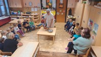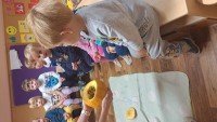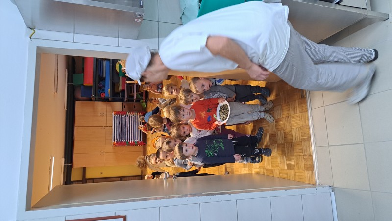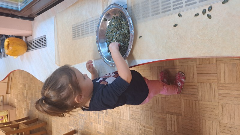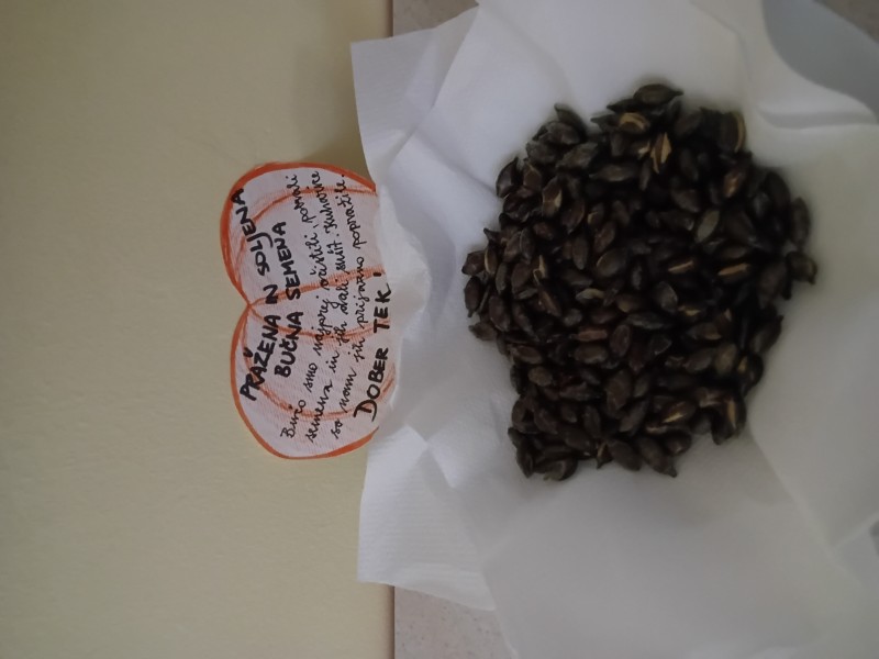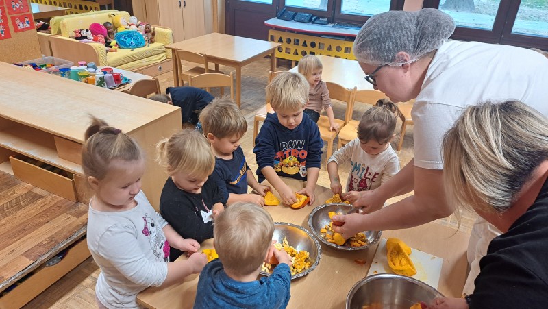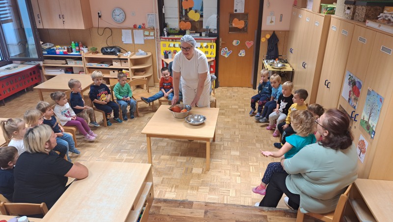 V skupini 3 -4 leta starih otrok smo izvajali tematski sklop Buče in bučke. Bučo smo tehtali, ugotavljali njene vizualne značilnosti, ji odstanili semena, ki smo jih v sodelovanju s kuhinjo tudi posušili in poskusili. V okviru teme smo tudi likovno ustvarjali in spoznali pravljico Helen Cooper Juha, ki iz buč se skuha, ki nam je dala navdih, da tudi sami pripravimo bučno juho. V sodelovanju s kuharico Sonjo smo jo tudi pripravili. Bila je zelooo okusna!