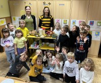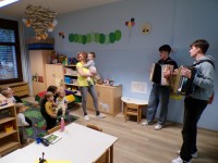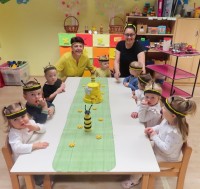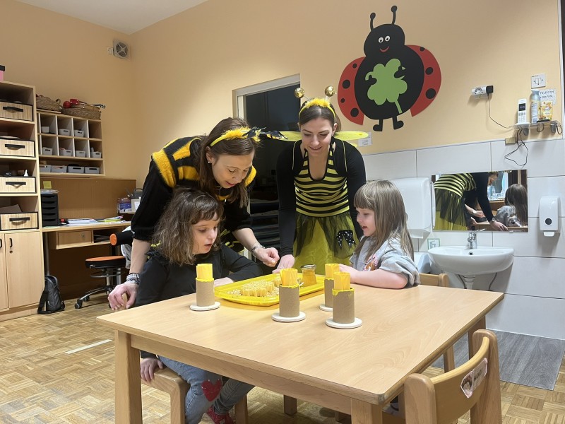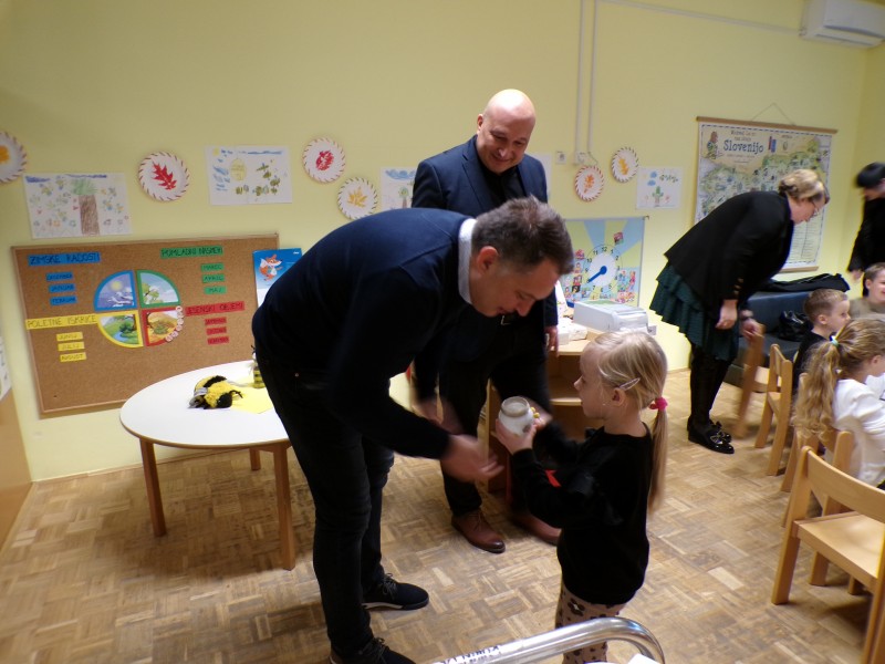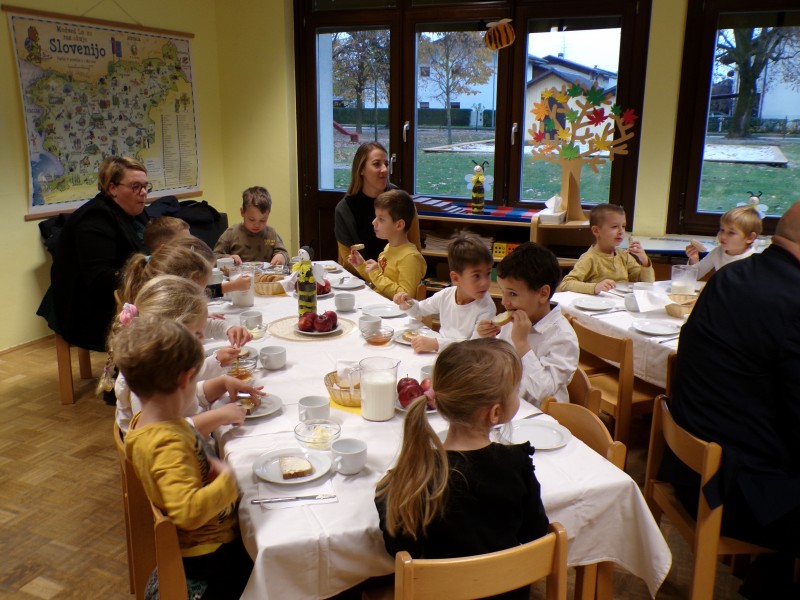 Ob letošnjem Tradicionalnem slovenskem zajtrku nas je v naši enoti obiskal župan g. Damjan Anželj. Otroci so ga radovedno in z navdušenjem sprejeli. Skupaj smo pokramljali o pomenu lokalne hrane. Župan je bil navdušen nad njihovo zgovornostjo in številnimi vprašanji, otroci pa so se razveselili priložnosti, da tudi sami z njim delijo svoje misli. Dogodek smo obogatili tudi s posebnim glasbenim trenutkom: v sodelovanju s Čebelarsko zvezo Slovenije in ob spremljavi harmonikarjev ter kitaristke so otroci zapeli Slakovo pesem »Čebelar«, ob kateri je vrtec napolnila topla in vesela energija. Dopoldne je minilo v prijetnem vzdušju, polnem smeha in pozitivne energije.