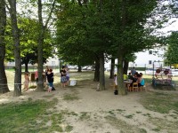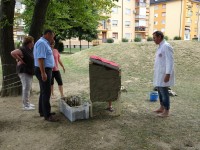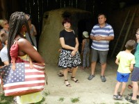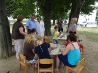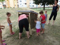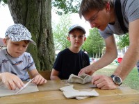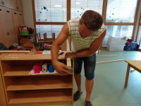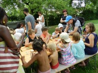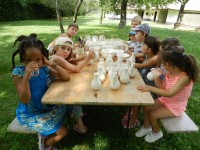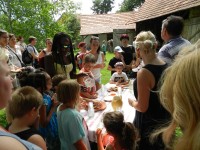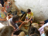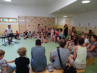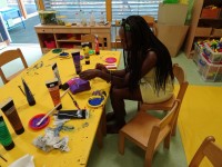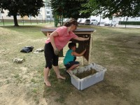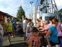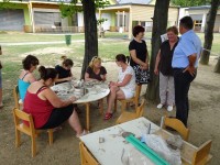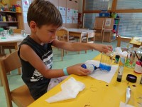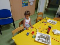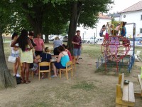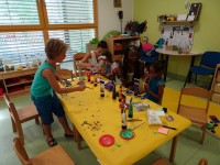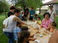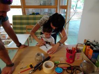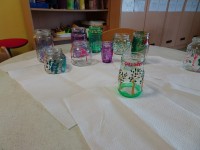 S pesmijo smo danes naredili uvod v delavnice. Otroci in odrasli smo se družili ob slikanju na steklo, izdelovanju posodic in hiške iz gline, izdelovanju table dobrodošlice, izrezovanju in sestavljanju avtomobilov, plesu in opremljanju lesa z barvami za izdelavo lovilca zvoka.