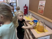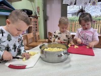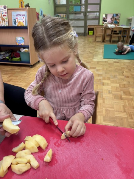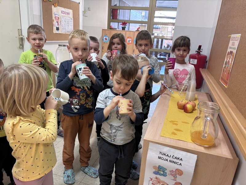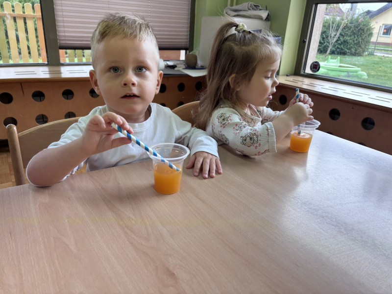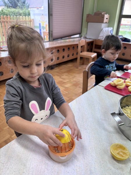 V našem vrtcu smo se odločili, da bomo otrokom približali pripravo zdravega in naravnega napitka – zato smo skupaj naredili domači sok iz korenja in jabolk. Za navdih nam je bila Urška Fartelj, ustvarjalka kulinaričnega bloga 220 stopinj poševno in avtorica več kuharskih priročnikov, ki nas s svojimi preprostimi in zdravimi recepti vedno znova navduši. Najprej smo si skupaj ogledali korenje in jabolka, ju povonjali, otipali in se pogovorili o tem, kje rasteta in zakaj sta zdrava. Otroci so ugotovili, da iz tako preprostih živil lahko nastane nekaj zelo dobrega. Nato smo jih oprali, narezali in pripravili za kuhanje. Ko je bilo vse kuhano, smo korenje in jabolka spasirali, dodali malo vode in dobili čudovit, oranžen, okusen sok, ki so ga otroci z veseljem poskusili. Otroci so s ponosom opazovali, kako iz sveže zelenjave in sadja nastane sok, in ga z veseljem popili do zadnje kapljice. Skupaj smo znova dokazali, da so najboljše stvari – najpreprostejše.