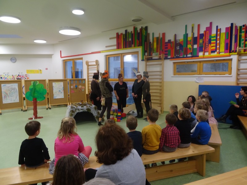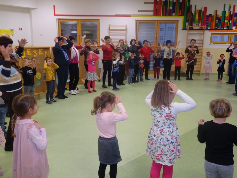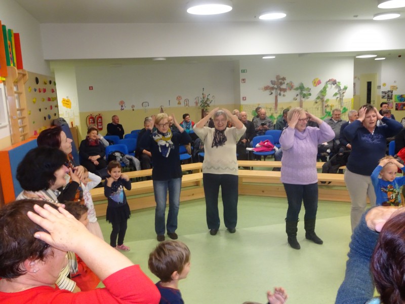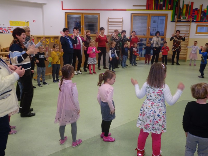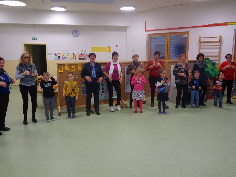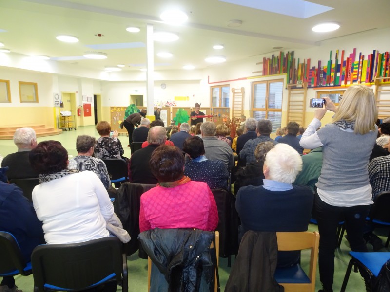 Skupaj smo si ogledali gledališko predstavo Pod medvedovim dežnikom, jim pripravili kratki program in se družili ob plesu, kramljanju in okušanju piškotov, katere smo naredili sami za ta poseben obisk.