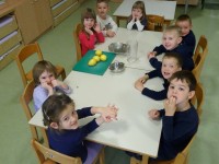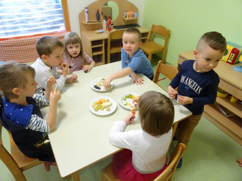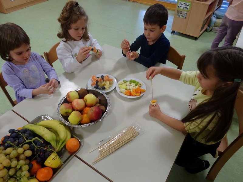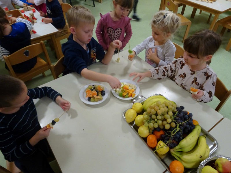 V naši skupini smo se v preteklih dneh veliko pogovarjali o tem, kako lahko z zdravim načinom življenja poskrbimo za dobro počutje. Skupaj z otroki, starimi 4–5 let, smo raziskovali pomen zdrave prehrane, rednega gibanja in skrbi za osebno higieno. Otroci so z velikim zanimanjem spoznavali različna živila ter skupaj razmišljali, katera od njih nam dajejo energijo in nas ohranjajo zdrave. Najbolj pa so uživali pri pripravi sadnih nabodal, sadnih “bonbonov” in osvežilne domače limonade. Pri tem smo spodbujali medsebojno sodelovanje, pogum pri okušanju novih okusov ter razvijali ročne spretnosti.