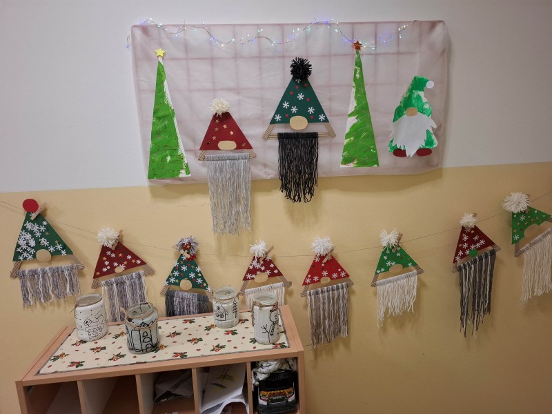 Naše spretne roke so izdelovale čudovite škrate, ki so zdaj ponosna dekoracija naše igralnice in vnašajo praznično veselje v naše prostore.