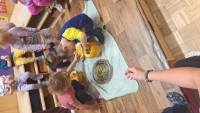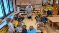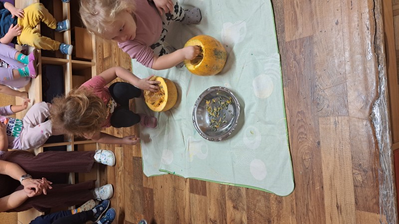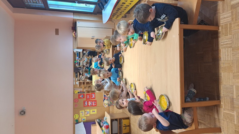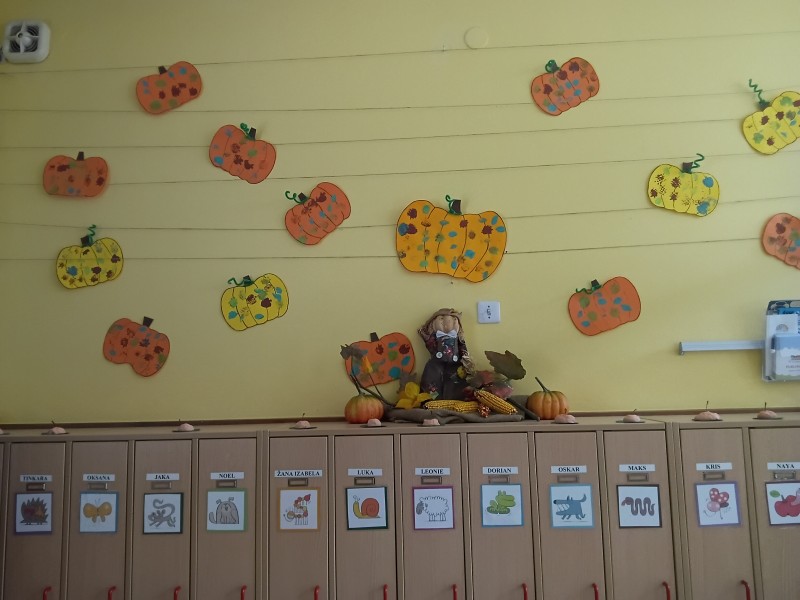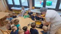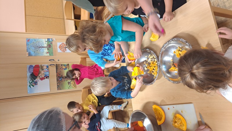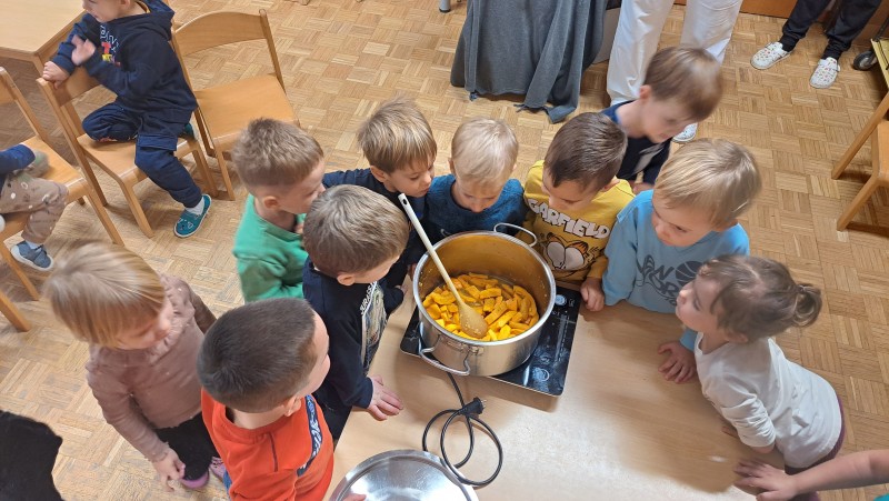 V skupini 3 -4 leta starih otrok smo izvajali tematski sklop Buče in bučke. Bučo smo tehtali, ugotavljali njene vizualne značilnosti, ji odstanili semena, ki smo jih v sodelovanju s kuhinjo tudi posušili in poskusili. V okviru teme smo tudi likovno ustvarjali in spoznali pravljico Helen Cooper Juha, ki iz buč se skuha, ki nam je dala navdih, da tudi sami pripravimo bučno juho. V sodelovanju s kuharico Sonjo smo jo tudi pripravili. Bila je zelooo okusna!