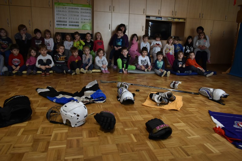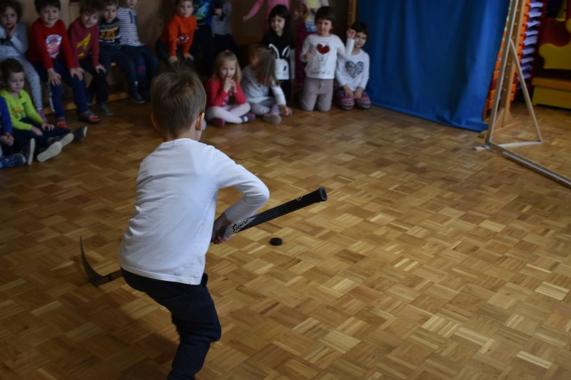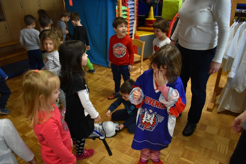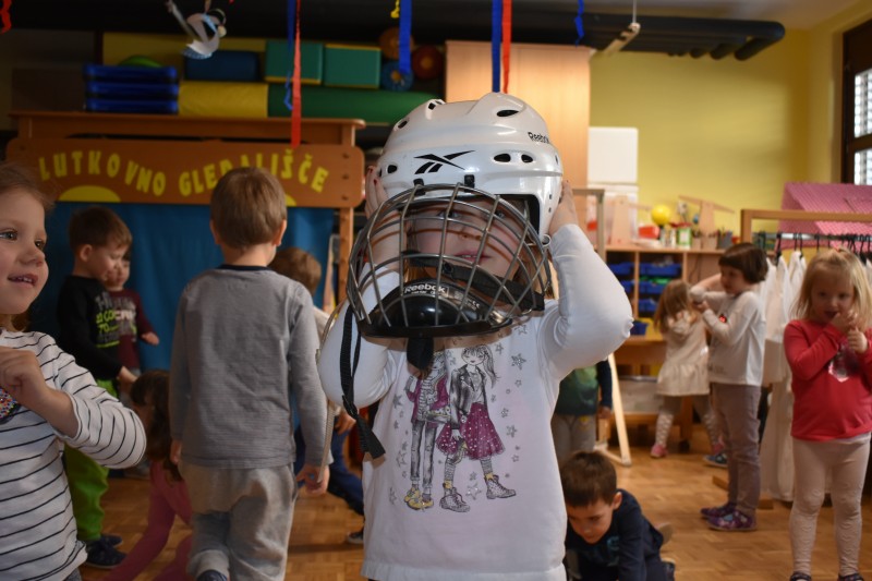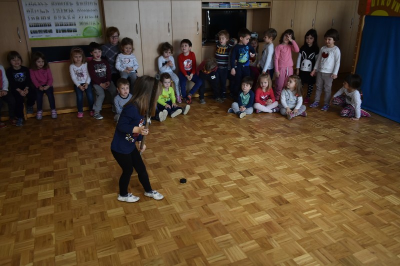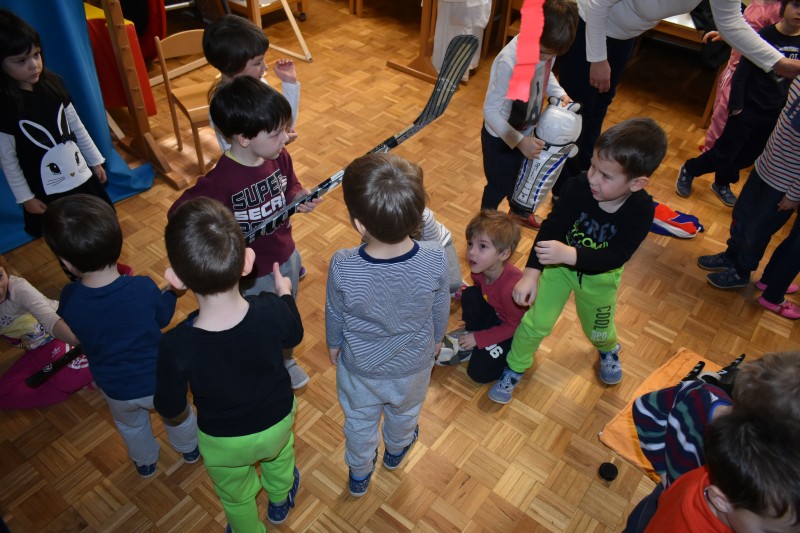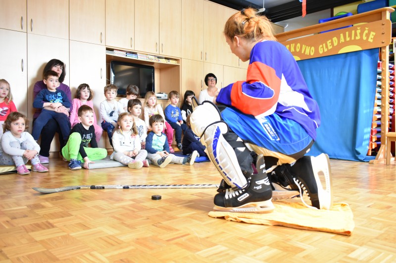 Tudi hokej na ledu je disciplina, v kateri so včeraj naši Risi premagali Združene Države Amerike. Temu primerno je bil obarvan tudi današnji dan v vrtcu. Obiskala nas je hokejistka Tina, ki nam je podrobno predstavila obvezno opremo za hokej na ledu, naučila nas je, da se hokejskemu ploščku pravilno reče PUCK (izgovori se kot PAK) in nam prikazala kako se učinkovito zadeva v gol.