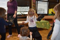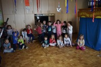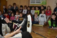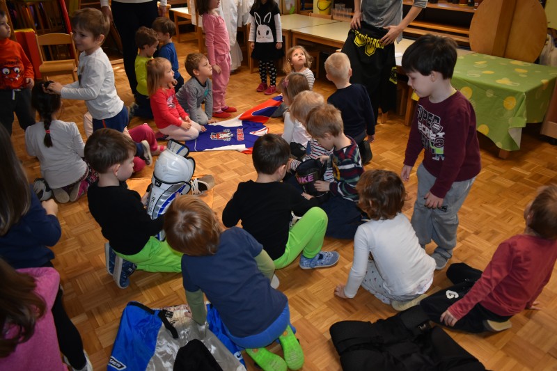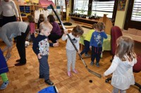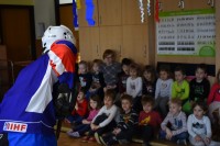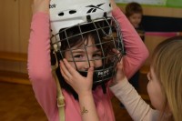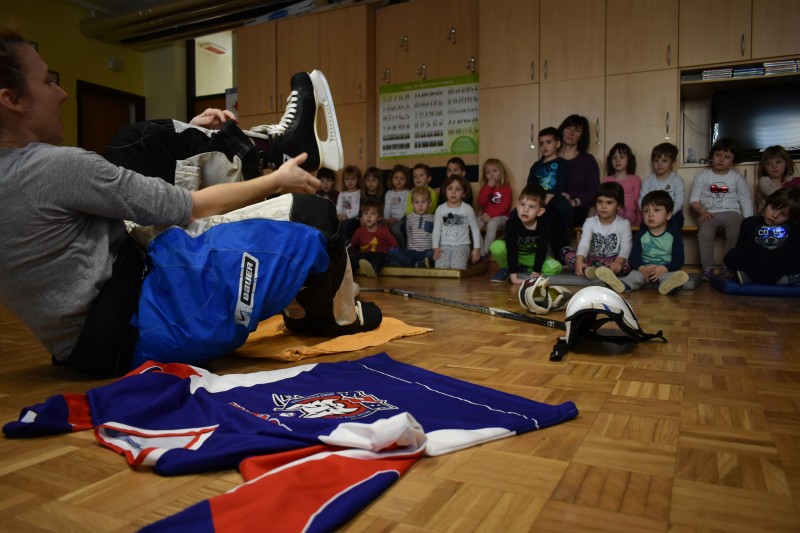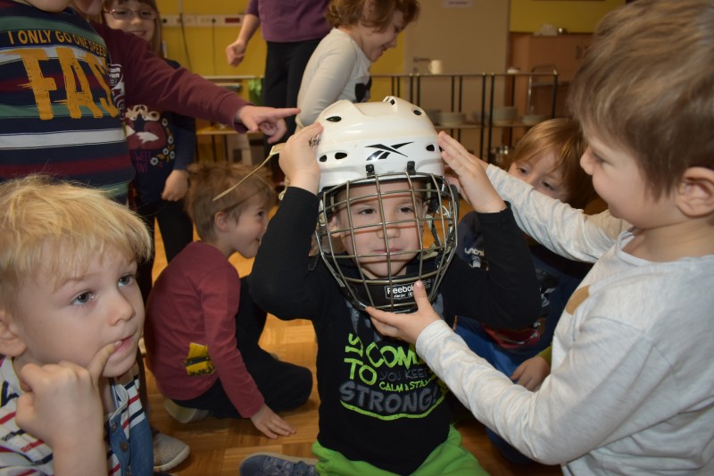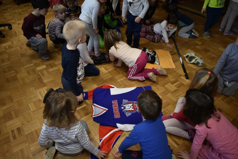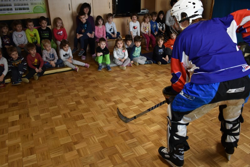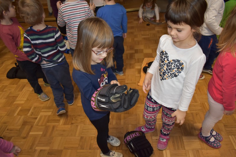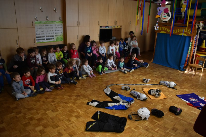 Tudi hokej na ledu je disciplina, v kateri so včeraj naši Risi premagali Združene Države Amerike. Temu primerno je bil obarvan tudi današnji dan v vrtcu. Obiskala nas je hokejistka Tina, ki nam je podrobno predstavila obvezno opremo za hokej na ledu, naučila nas je, da se hokejskemu ploščku pravilno reče PUCK (izgovori se kot PAK) in nam prikazala kako se učinkovito zadeva v gol.