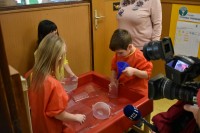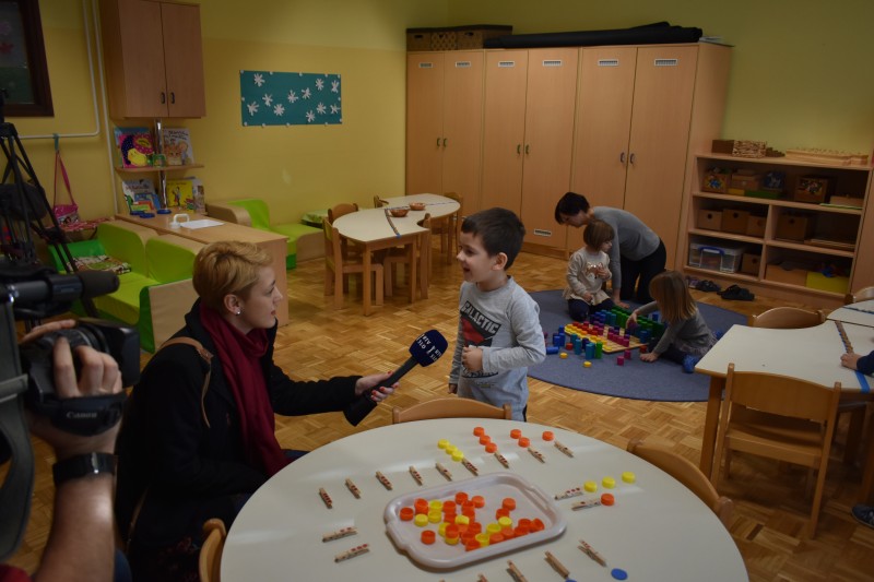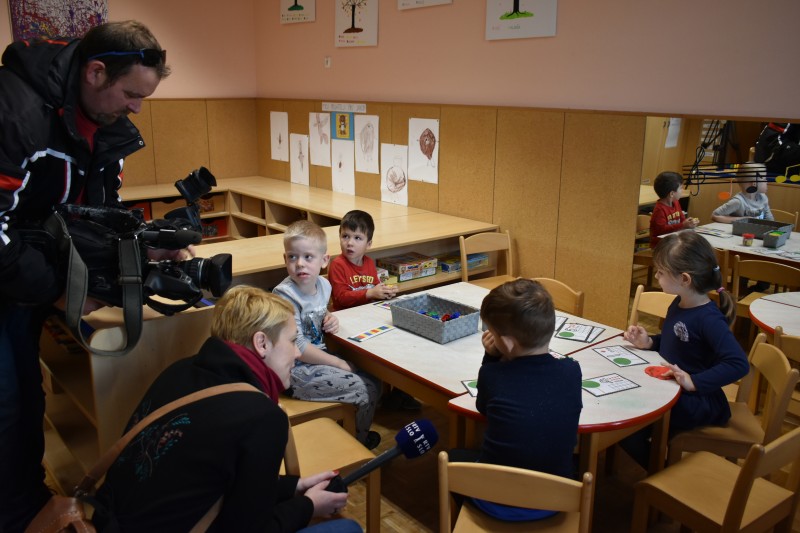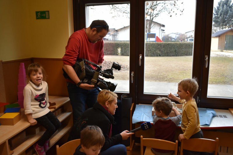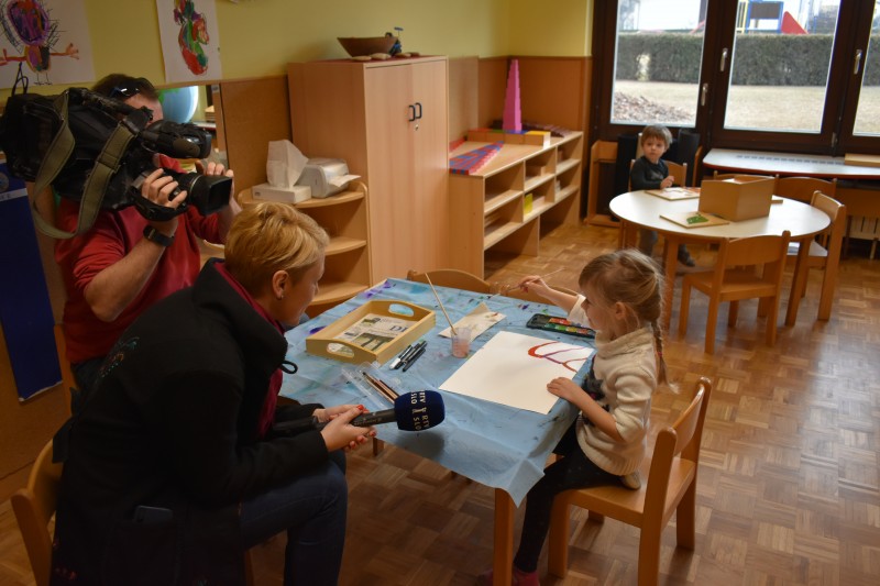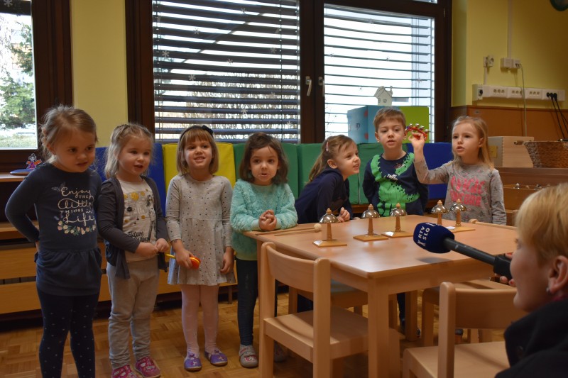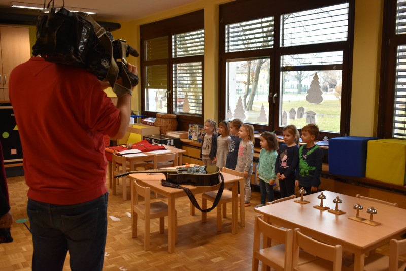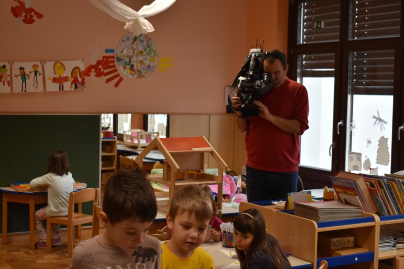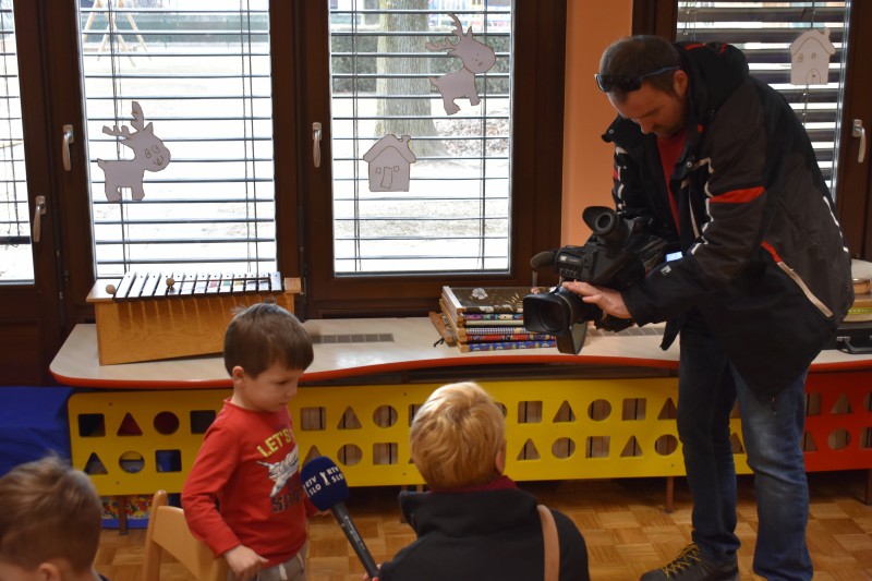 Današnji dan je potekal v znamenju kamere in mikrofona. Obiskala nas je ekipa RTV Slovenija, snemalec in novinarka, sta zbirala trenutke in izjave otrok o igri, zimi in snegu.