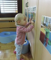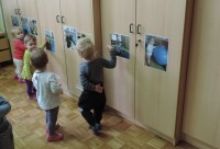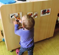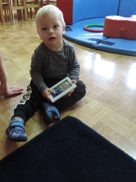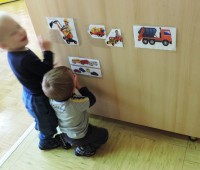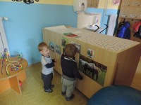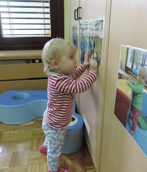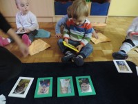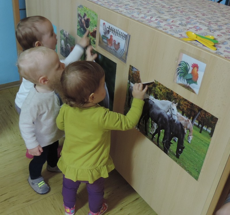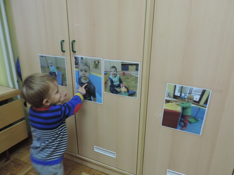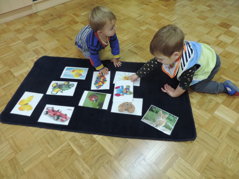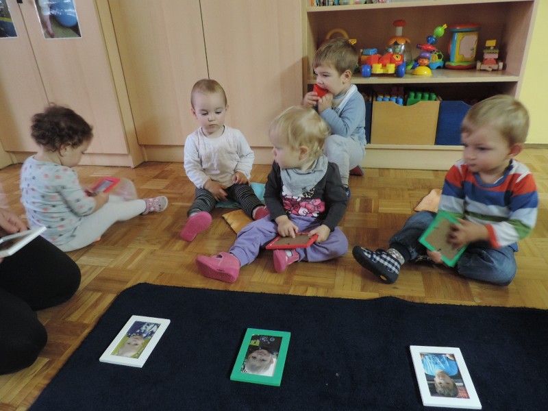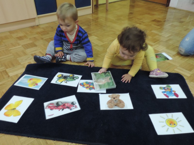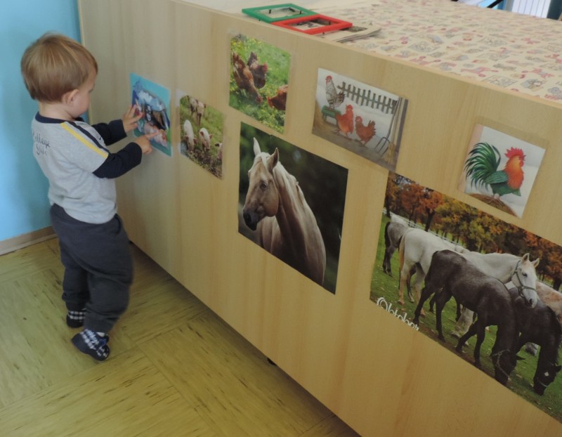 Slike so   razporejene  v otrokovem  vidnem polju, kot  spodbuda za govorno aktivnost – prve besede.