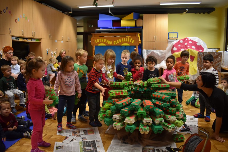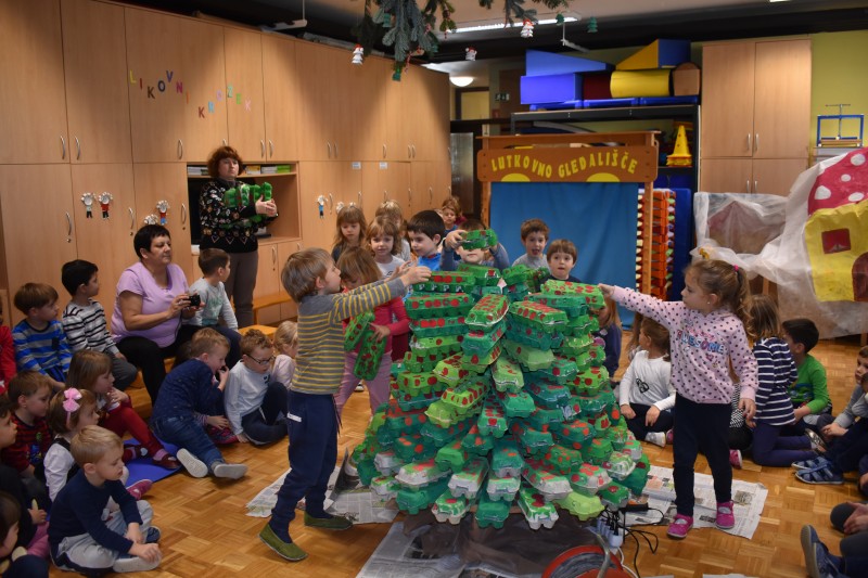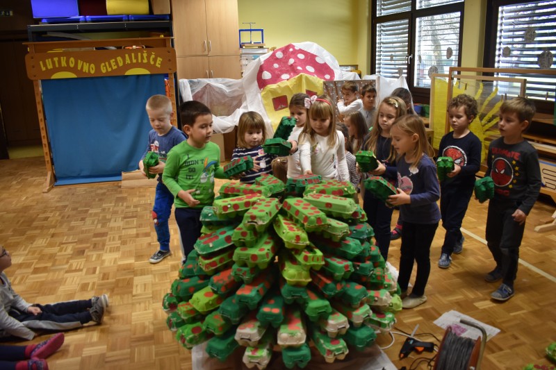 S skupnimi močmi pa smo prav tako postavili, oziroma sestavili, okolju prijazno jelko, ki krasi našo telovadnico. Vsi smo zelo ponosni in veseli, da nam je uspelo.