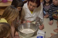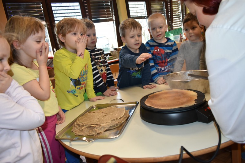 S pomočjo ge. Nataše, ki v našem vrtcu skrbi za zdravo prehrano, smo danes skupaj pekli ajdove palačinke in pripravljali pravo domačo nutello – zdrav namaz z lešniki. Za pripravo mase za palačinke smo potrebovali: ajdovo moko, jajca, mleko in vanilin sladkor. Med tem, ko smo za pravo domačo nutello potrebovali nekaj žličk kokosove maščobe, zrele banane, mlete lešnike in kakav v prahu. Tudi v naši igralnici je danes dišalo po ljubezni, tako kot v pravljici.