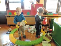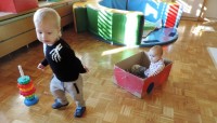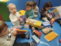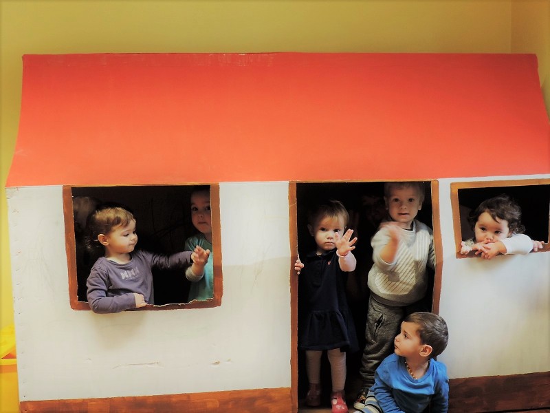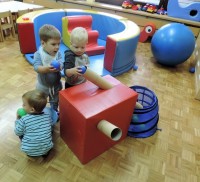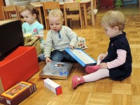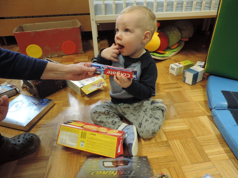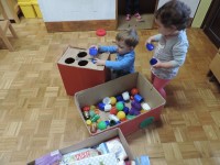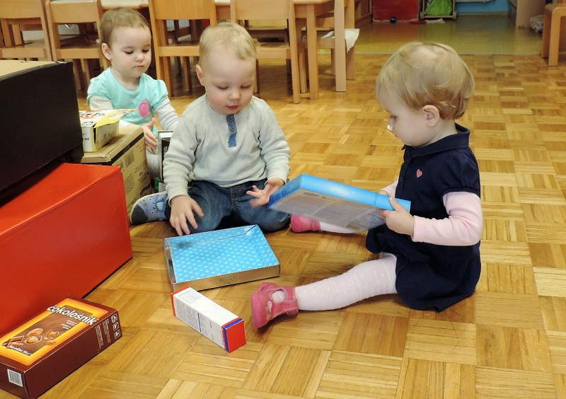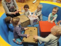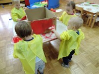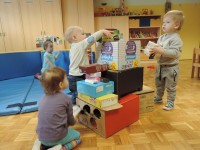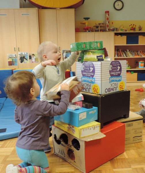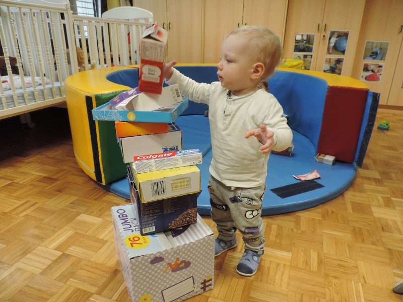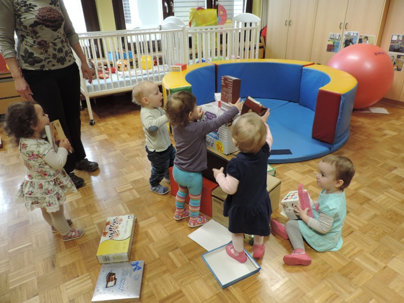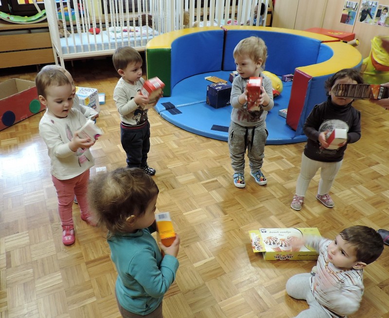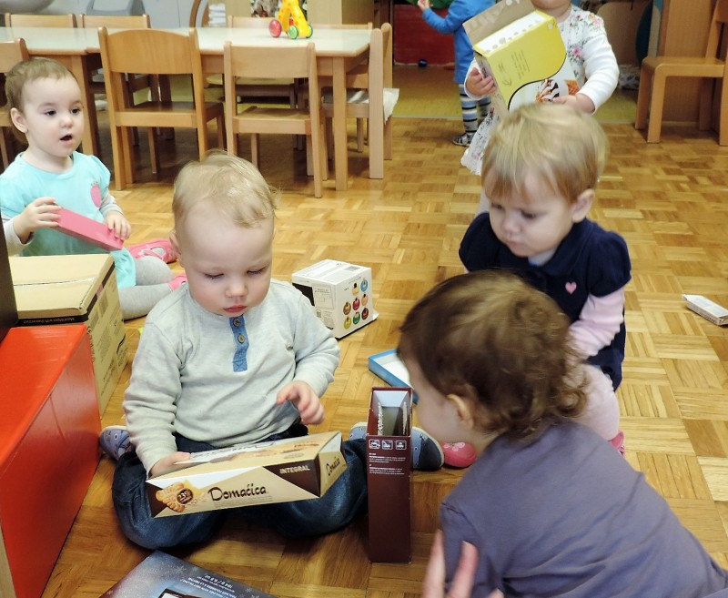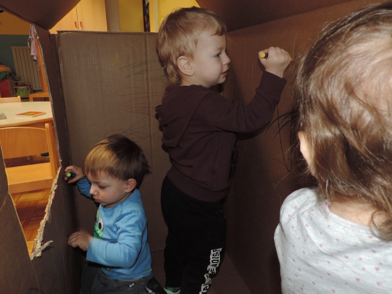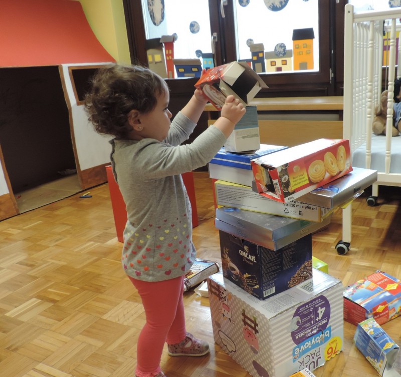 …ali prostor za predstave, za skrivanje, za druženje in tudi dom Muce Copatarice…Otrokom so različne škatle ves čas na voljo. Z njimi se igrajo, gradijo, se razgibajo, služijo jim namesto bobna, namesto avta ali kot didaktično sredstvo. Kar je na škatlah narisano in napisano otroci radi »berejo« - že tako majhni spoznavajo vlogo simbolov in pisnega jezika.