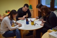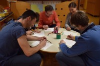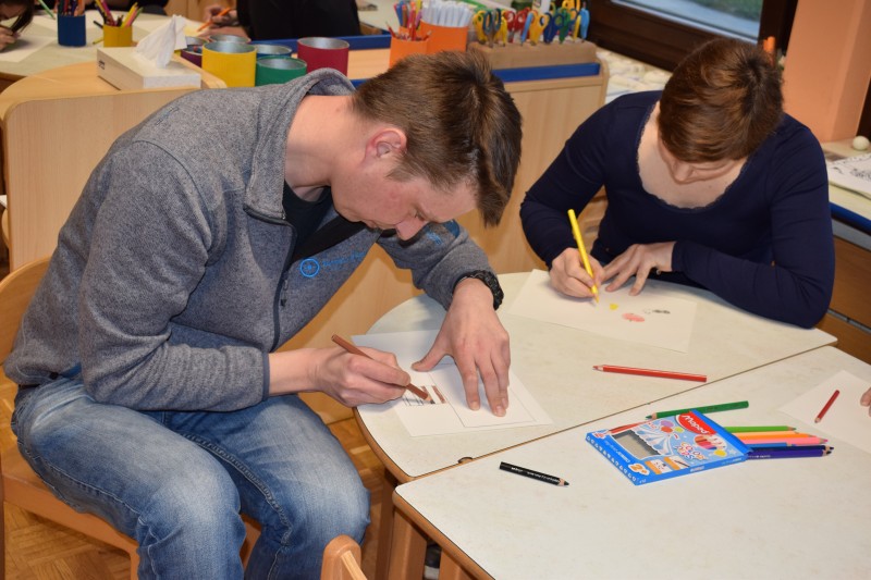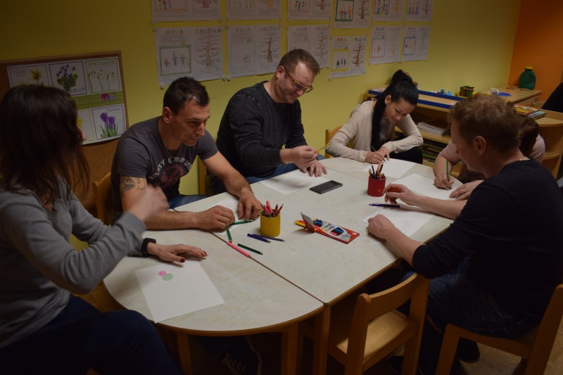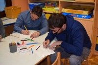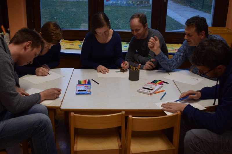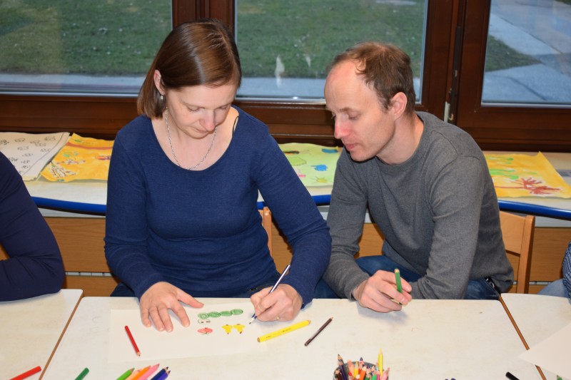 Naše druženje se je nadaljevalo v ustvarjalnem vzdušju, v dveh igralnicah so ločeno ustvarjali otroci in starši, slednji le redko rišejo ali slikajo, zato je to bila edinstvena priložnost, da svoja doživetja, videno in slišano prenesejo na papir.