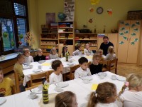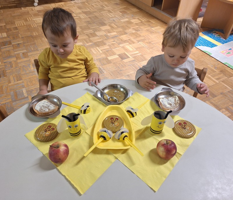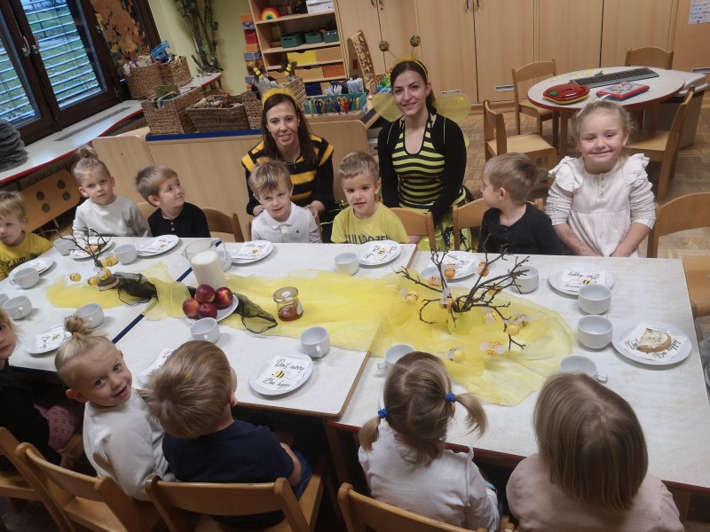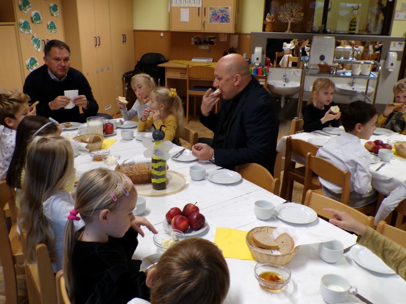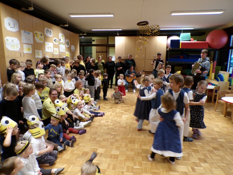 Ob letošnjem Tradicionalnem slovenskem zajtrku nas je v naši enoti obiskal župan g. Damjan Anželj. Otroci so ga radovedno in z navdušenjem sprejeli. Skupaj smo pokramljali o pomenu lokalne hrane. Župan je bil navdušen nad njihovo zgovornostjo in številnimi vprašanji, otroci pa so se razveselili priložnosti, da tudi sami z njim delijo svoje misli. Dogodek smo obogatili tudi s posebnim glasbenim trenutkom: v sodelovanju s Čebelarsko zvezo Slovenije in ob spremljavi harmonikarjev ter kitaristke so otroci zapeli Slakovo pesem »Čebelar«, ob kateri je vrtec napolnila topla in vesela energija. Dopoldne je minilo v prijetnem vzdušju, polnem smeha in pozitivne energije.