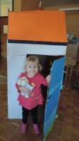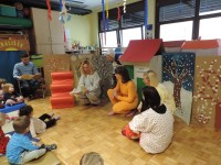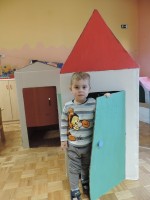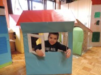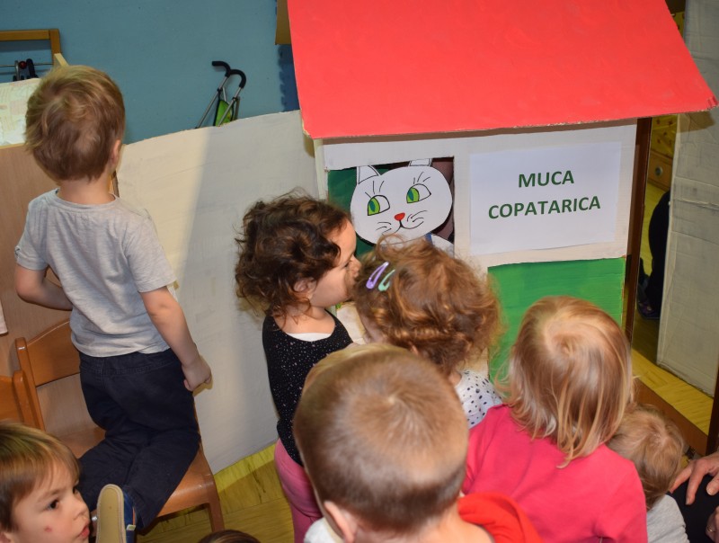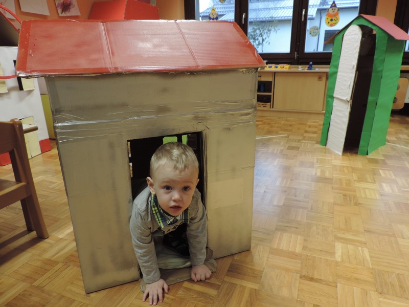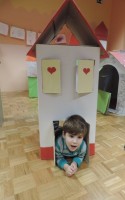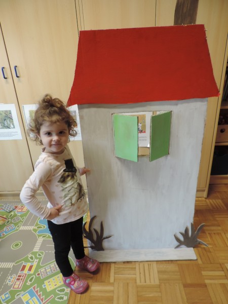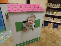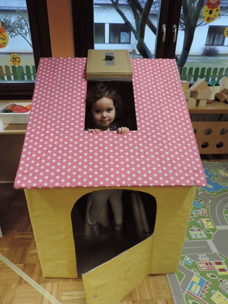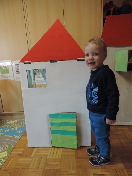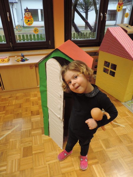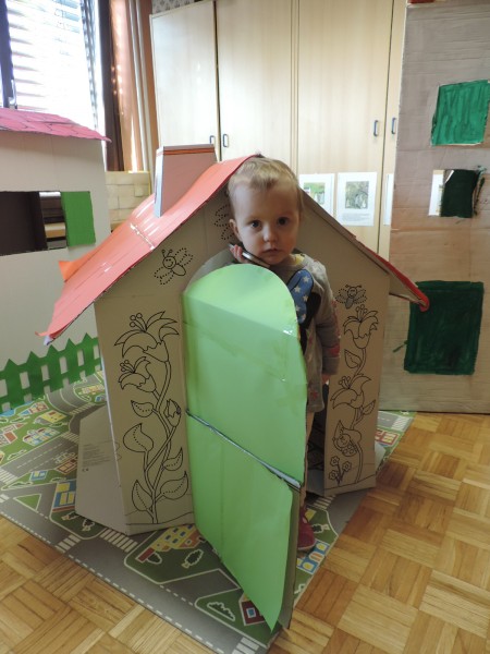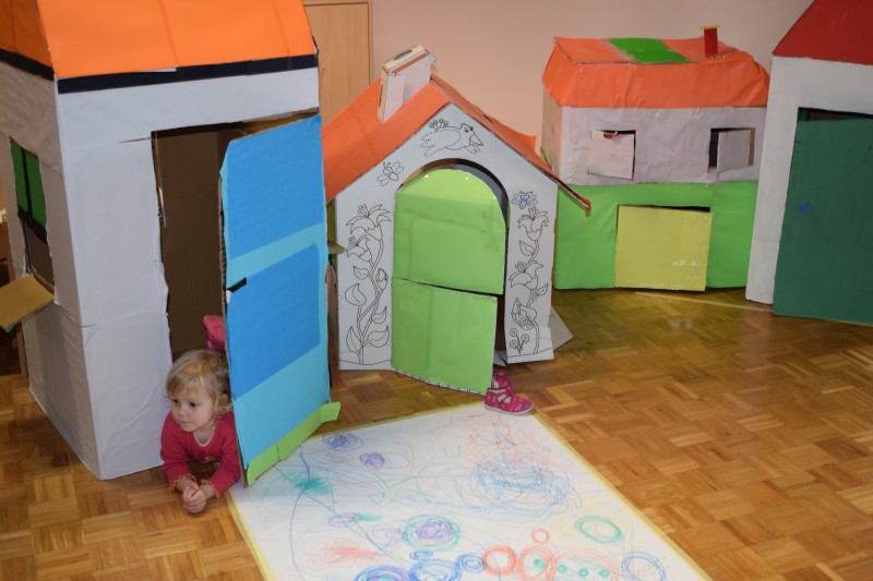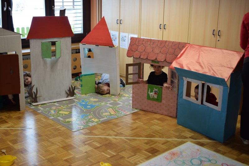 Doma so izdelali hišice za« MALO VAS«. In ko je bila »MALA VAS« nared, smo ustvarjali predstavo MUCA COPATARICA. Skozi proces igre smo raziskovali, ugotavljali, primerjali in ustvarjali. Otroci so pri tem krepili govor, socialne veščine in nenazadnje pridobivali na samopodobi, posamezniki ob tako spodbudnem okolju celo prvič spregovorili.