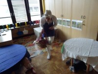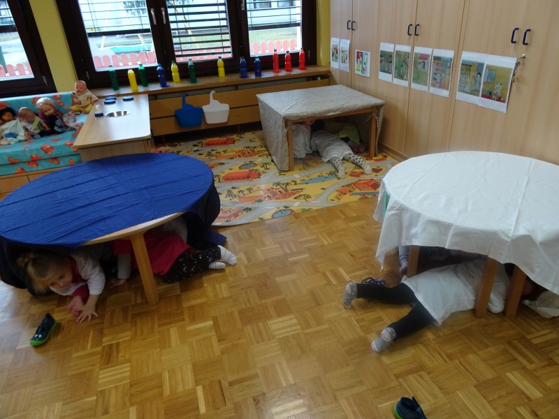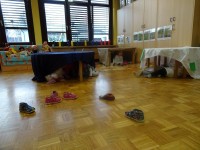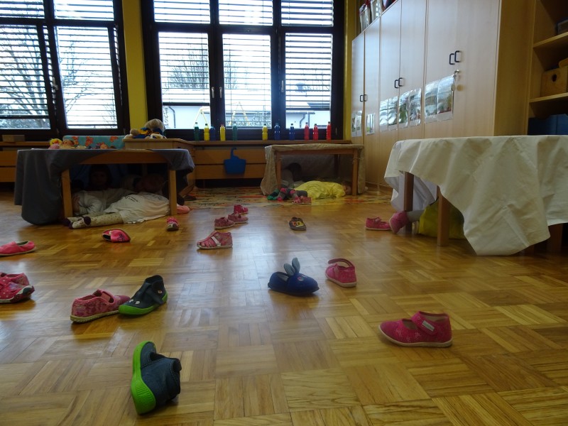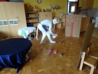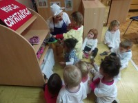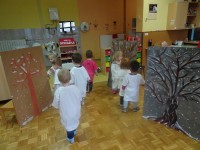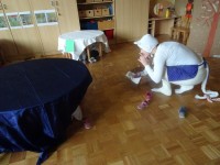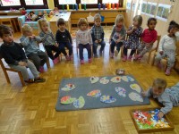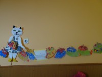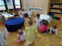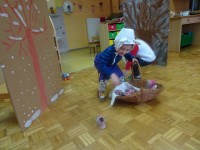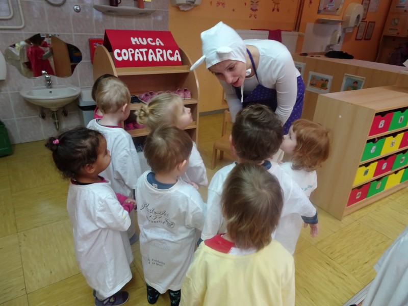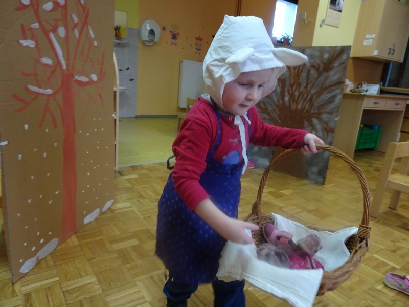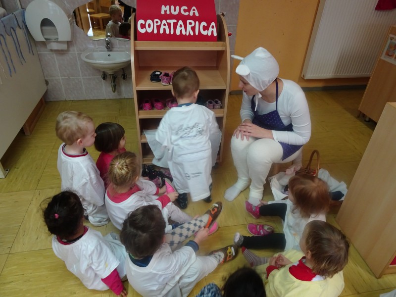 Preko pravljice Muca Copatarica so se otroci preizkušali v novi obliki verbalne komunikacije – igrah vlog. Stopiti v interakcijo z drugimi otroki in vzgojiteljem je  predstavljalo otrokom velik izziv.