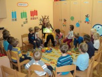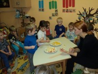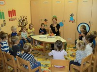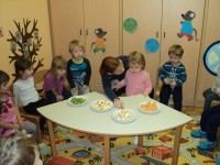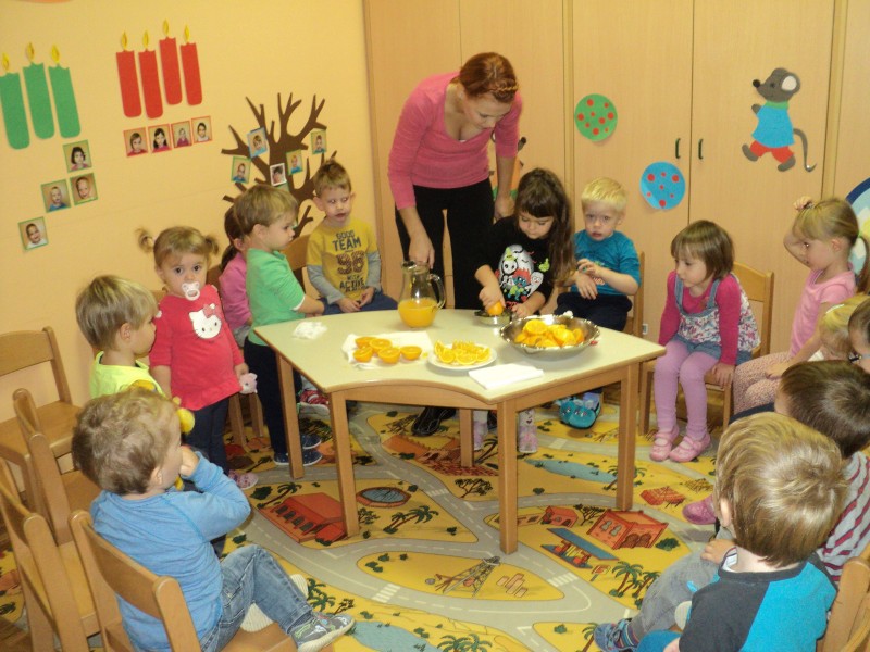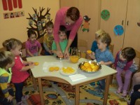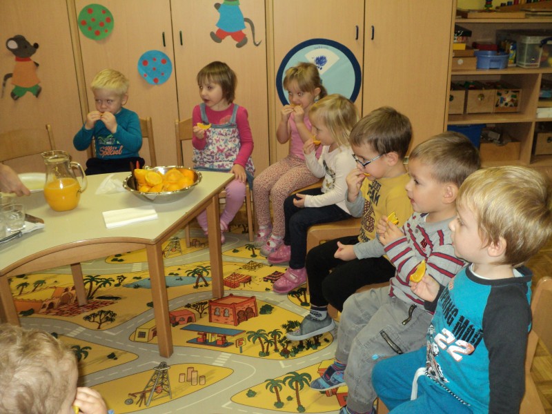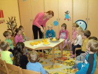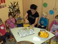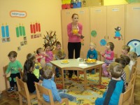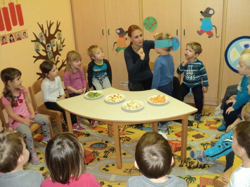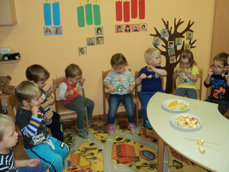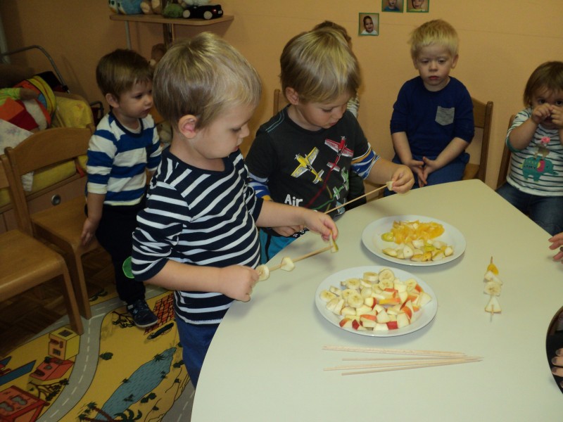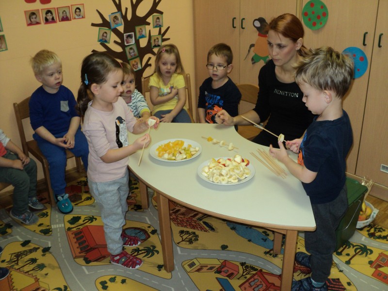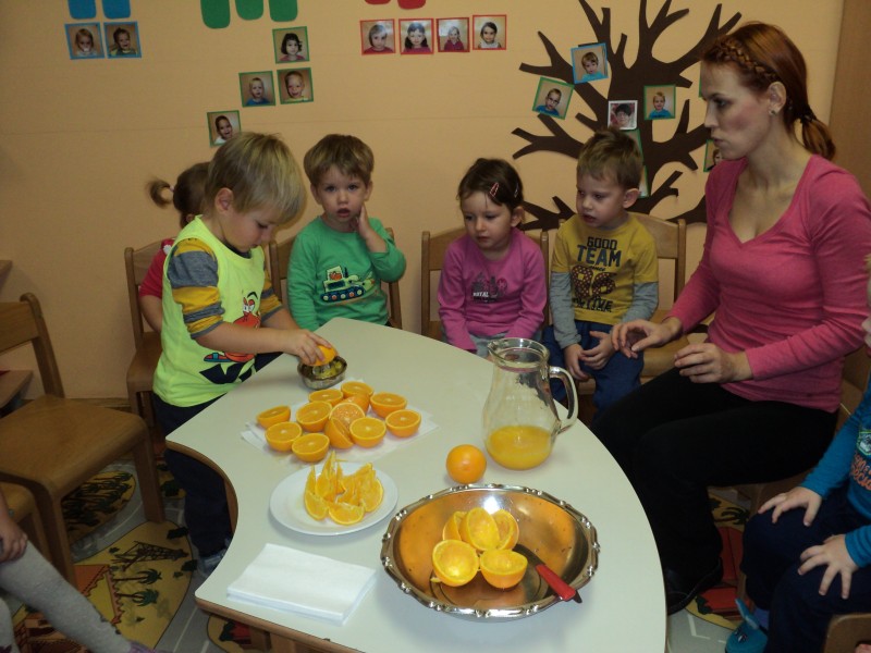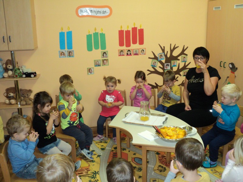 Otroci so preko različnih aktivnosti, kot so stiskanje soka, izdelovanje sadnih nabodal, okušanje različnega sadja z zavezanimi očmi… spoznali, da ima vsako sadje specifičen okus, ki je zelo dober in koristen za naše zdravje.