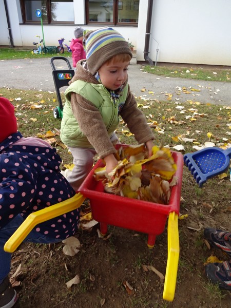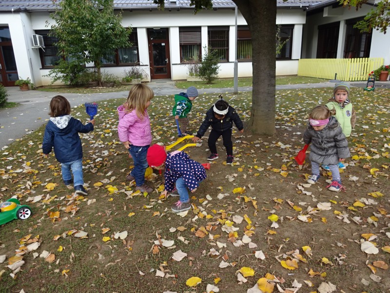 V vrtcu smo izkoristili lepo vreme za lovljenje sončnih žarkov in igre na prostem. Opazovali smo pisano listje v vetru, ga nabirali, grabljali, poslušali dežne kaplje ter skakljali po lužah.