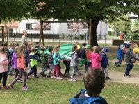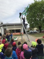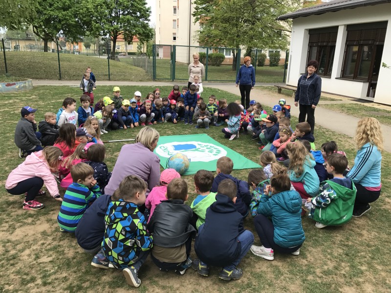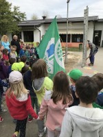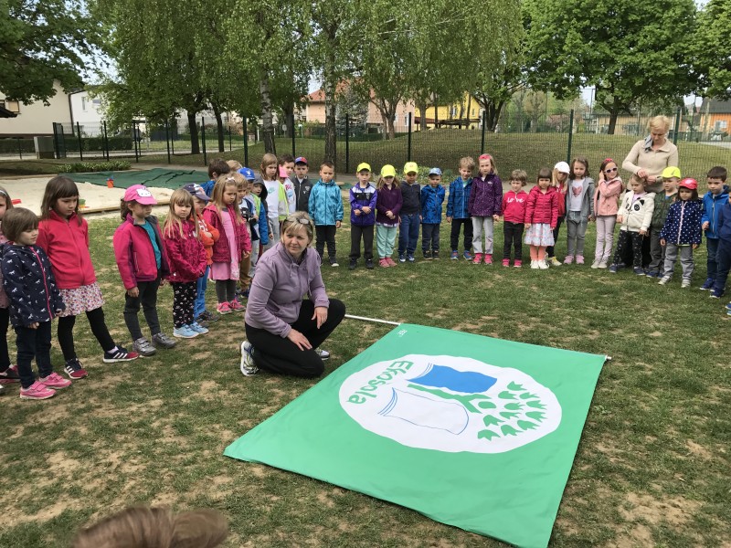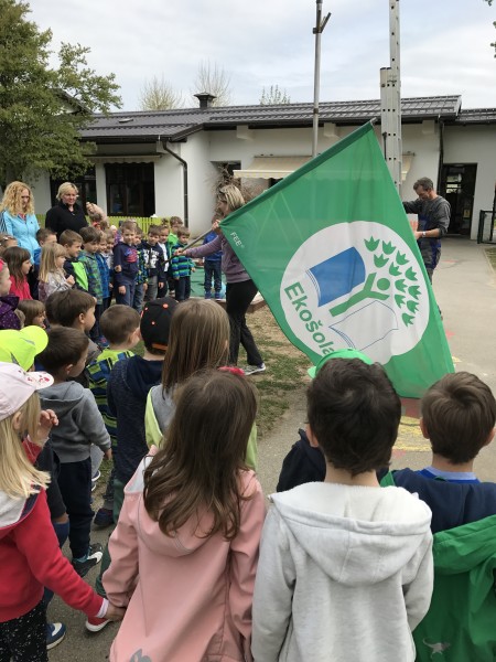 Danes nam je hišnik Branko snel Eko zastavo. Ugotavljali smo, kaj pomeni Eko zastava in zakaj visi pri nas. Da bi jo ob Dnevu Zemlje ponovno izobesili, smo pred zastavo obljubili, da bomo odnos do zemlje, drug do drugega in narave še poglobili.