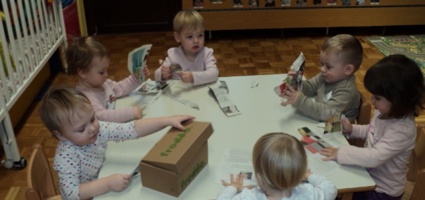 Za krepitev fine motorike prstov smo izvajali različne zaposlitve skozi igro. Otroci so trgali in vstavljali časopisni papir ter zamaške v posode, oblikovali, o...