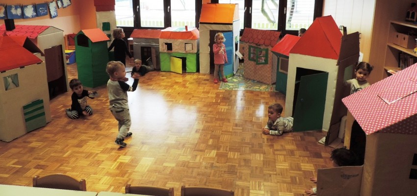 Za spodbudno učno okolje so tokrat poskrbeli tudi starši. Doma so izdelali hišice za« MALO VAS«. In ko je bila »MALA VAS« nared, smo ustvarjali predstavo MUC...