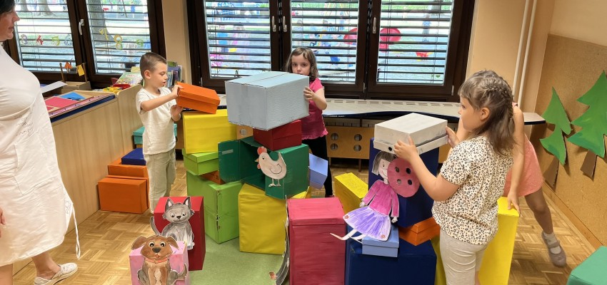 V prilagojenem programu so otroci spoznavali zgodbico Hišica iz kock (E. Peroci). V vrtec so prinesli odpadne škatle za čevlje in jih pobarvali. Zgodbico so naj...