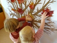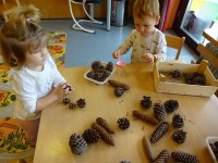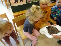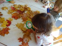 V skupini 2-3 let smo se podali v doživljanje, odkrivanje in raziskovanje jeseni in njenih darov. Igrali smo se z jesenskimi plodovi in barvitimi listi. Najbolj pa smo se razveselili obiska. Izpod listja je pokukal ježek. Bili smo tako navdušeni, da smo mu zapeli pesmico.