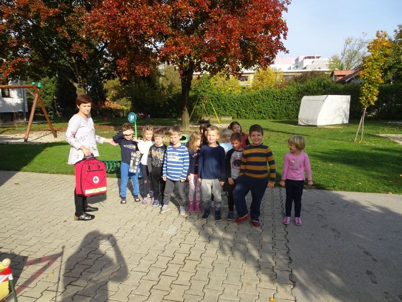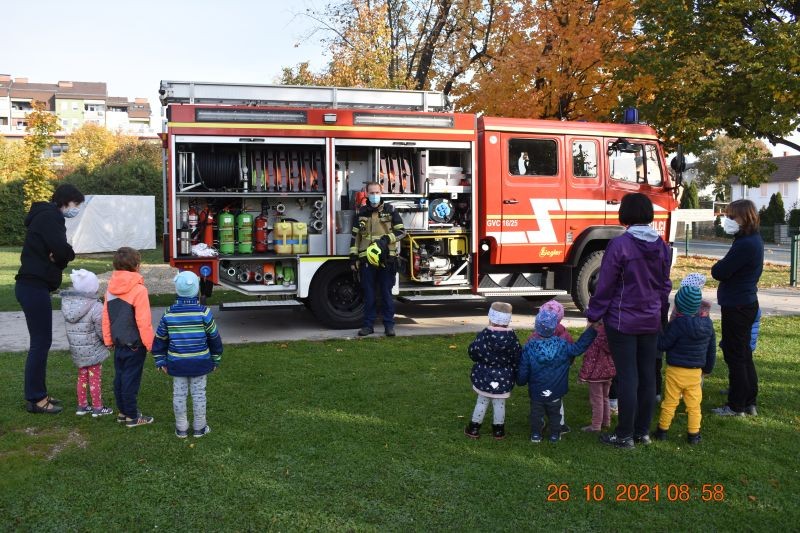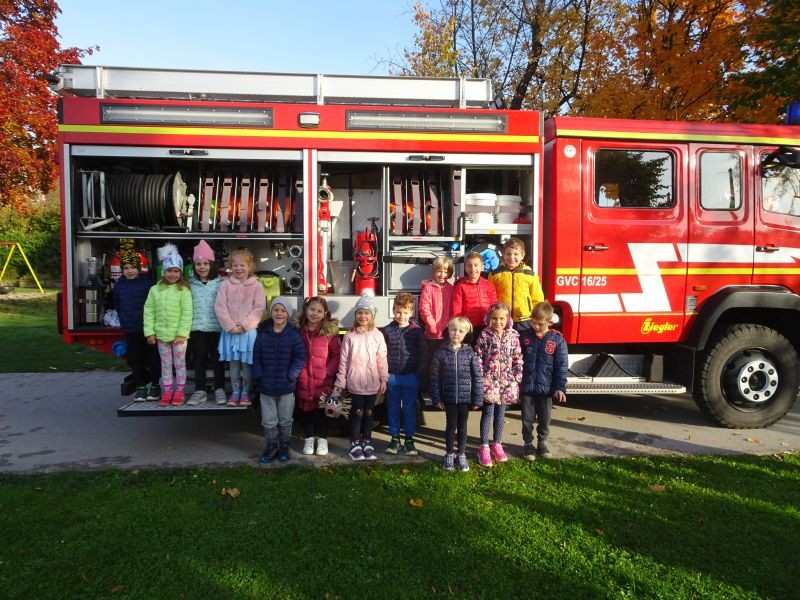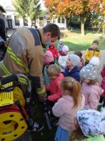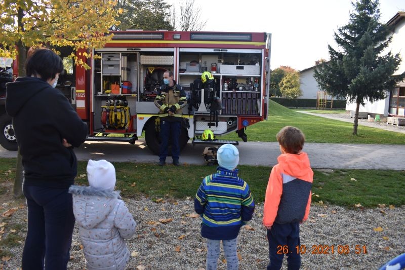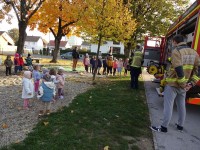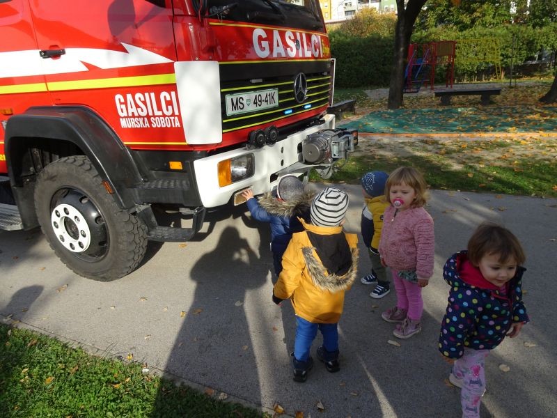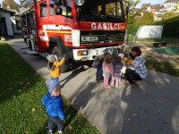 Oktober je mesec požarne varnosti, zato smo v vrtcu izvedli evakuacijsko vajo. Z otroci smo se pogovarjali kaj moramo storiti če pride do požara. Ogledali smo si tudi posnetke o gasilcih obiskali pa so nas tudi v vrtcu, kjer so si lahko otroci pobliže ogledali gasilski avto ter vprašali gasilce če jih kaj zanima.
