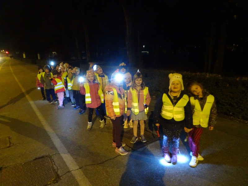 V petek, 19.11.2021, je končno prišel dan, ko smo se v popoldanskih urah vrnili s prtljago nazaj v vrtec ter tukaj prespali. Otroci so bili tako neučakani, da so že ves teden samo odštevali dneve ter se z velikim nasmeškom vrnili nazaj. Niti ni bilo časa za poslavljanje, saj so nas že čakale delavnice povezane z vesoljem. Ko smo se posladkali s palačinkami, se uredili, vzeli svetilke, smo se odpravili na nočni pohod po mestu. S teleskopom smo si še ogledali zvezde in polno luno, nato pa umili zobke, oblekli pižame in že bili pripravljeni na ples v pižamah. Po pestrem dogajanju smo ob risanki sladko zaspali. Zjutraj pa je zelo hitro prišla ura, ko je bil čas za odhod domov. Imeli smo se lepo, se zabavali in bili zelo pogumni. Seveda je sledilo vprašanje »Gda zaj pa spijmo v vrtce?«.