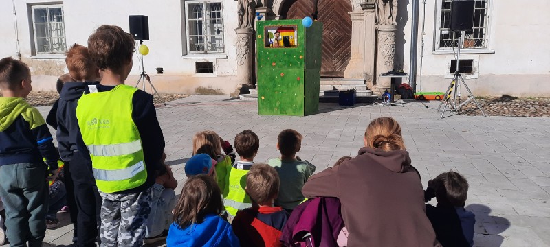Otroci starejših skupin smo si ogledali predstavo-Kako je nastal bicikel.