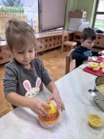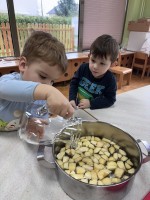V našem vrtcu smo se odločili, da bomo otrokom približali pripravo zdravega in naravnega napitka – zato smo skupaj naredili domači sok iz korenja in jabolk. Za navdih nam je bila Urška Fartelj, ustvarjalka kulinaričnega bloga 220 stopinj poševno in avtorica več kuharskih priročnikov, ki nas s svojimi preprostimi in zdravimi recepti vedno znova navduši. Najprej smo si skupaj ogledali korenje in jabolka, ju povonjali, otipali in se pogovorili o tem, kje rasteta in zakaj sta zdrava. Otroci so ugotovili, da iz tako preprostih živil lahko nastane nekaj zelo dobrega. Nato smo jih oprali, narezali in pripravili za kuhanje. Ko je bilo vse kuhano, smo korenje in jabolka spasirali, dodali malo vode in dobili čudovit, oranžen, okusen sok, ki so ga otroci z veseljem poskusili. Otroci so s ponosom opazovali, kako iz sveže zelenjave in sadja nastane sok, in ga z veseljem popili do zadnje kapljice. Skupaj smo znova dokazali, da so najboljše stvari – najpreprostejše.