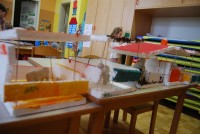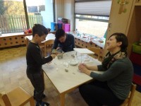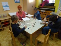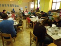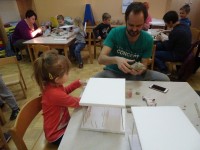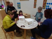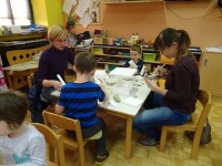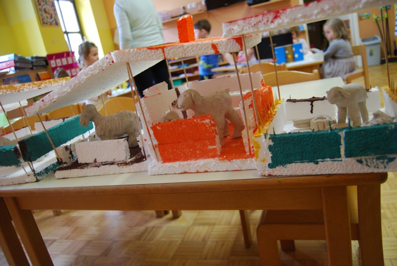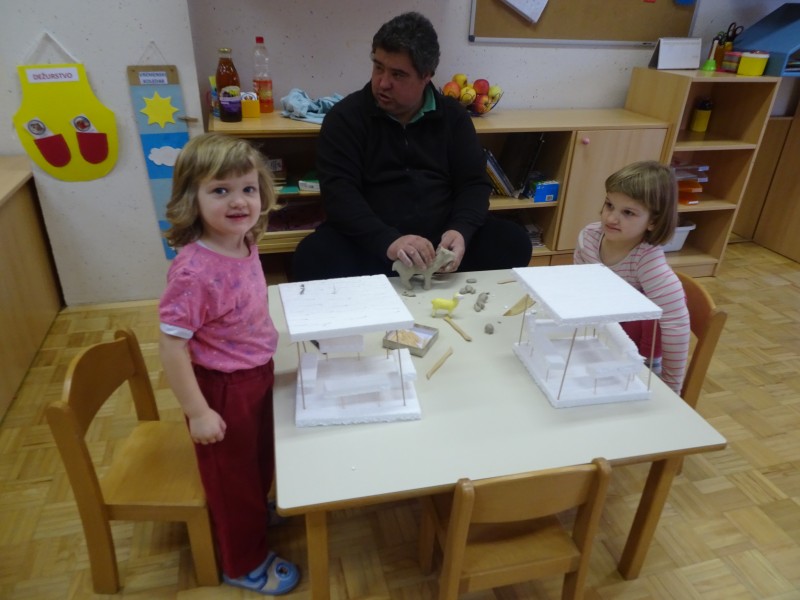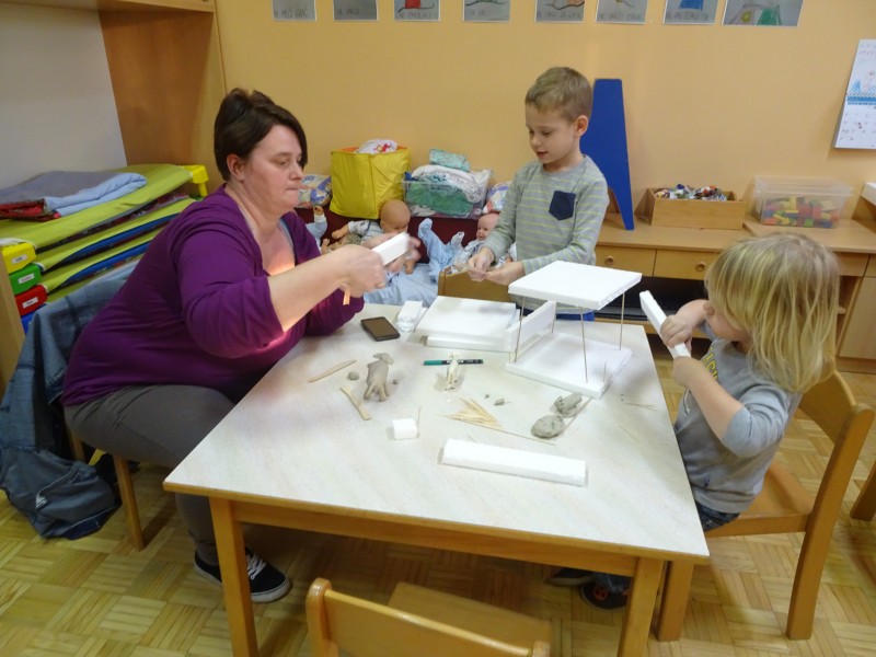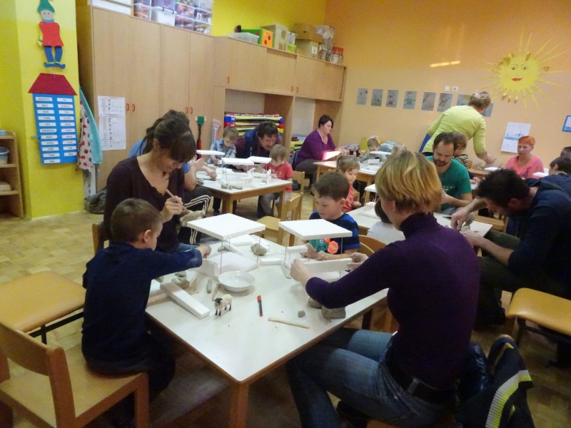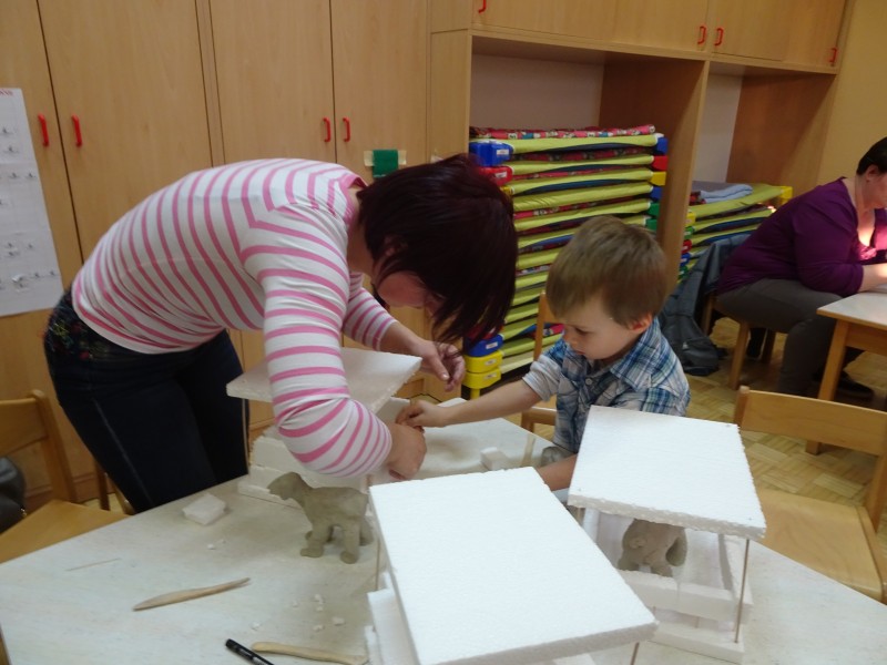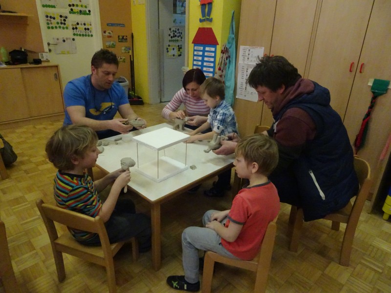 Otroci in starši so se v uvodnem delu seznanili z glino in stiroporom. Pogovarjali smo se o naravnih in umetnih materialih, nato pa je sledila je predstavitev motiva. Izdelati so morali farmo drobnice (koze in ovce), iz stiropora pa hlev za drobnico. Starši in otroci so pri tem sodelovali in neznansko uživali.