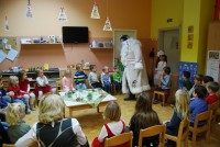 Dedka Mraza namreč, saj smo se na njegov prihod pripravljali že od začetka decembra. Da bi lažje našel pot do nas, smo okrasili igralnice, jelko, posejali pšenico, pogosto peli njegove pesmice in se prav za njegov prihod naučili novo dramatizacijo, deklamacijo in pesmico. Seveda ni manjkalo pismo, v katerem smo zapisali, da se trudimo biti pridni, želimo si kakšnih daril, še bolj pa nam je pomembno srečanje z njim. In potekalo je vse tako, kot smo si zamislili….
