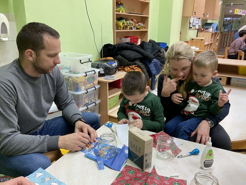 Praznično – ustvarjala delavnica s starši, v oddelku 1 - 3 let in 3 - 6 let, nas je popeljala v čarobnost decembrskih dni. Otroci so si skupaj s starši izdelali čudovite laterne, ki jim bodo služile na pohodu. Ves čas je vladalo prijetno ustvarjalno vzdušje. Več pa si lahko ogledate v galeriji.