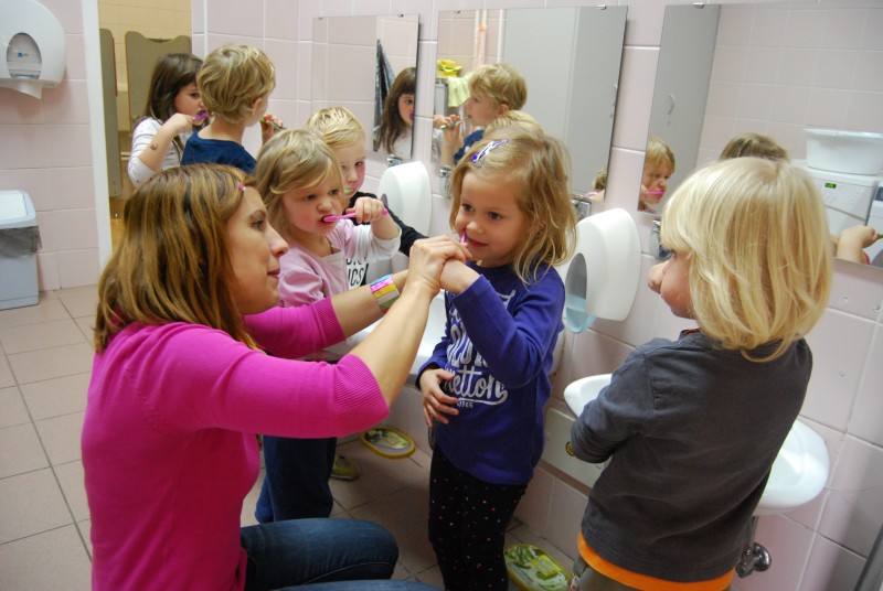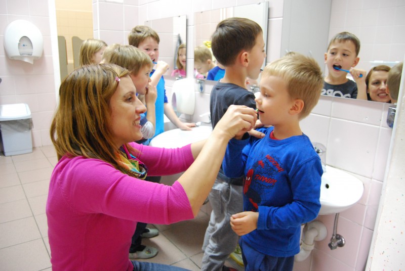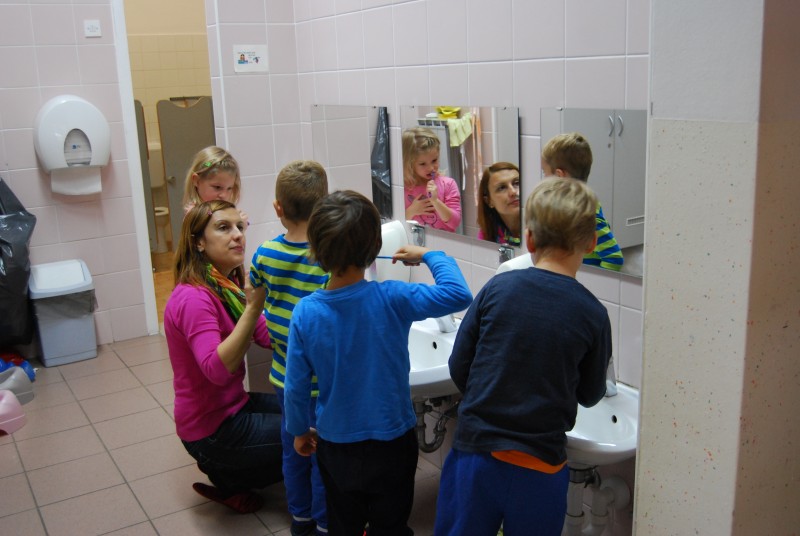 Skrb za ustno higieno je ena od osnovnih nalog, ki jo moramo opravljati vestno in redno, v kolikor želimo imeti zdrave zobe. V vrtcu smo imeli na obisku zobno asistentko Andrejo, ki nas je poučila o pravilni ustni higieni. Zelo pomembno je, da se otroci že od malega navadijo skrbeti za higieno v svojih ustih. Spoznali so kako se pravilno čisti zobe, kaj je za zobe škodljivo in kaj koristno. Z dobro ustno higieno bo tudi strah pred zobozdravnikom odveč.
