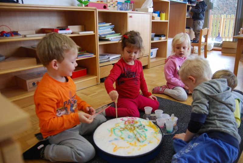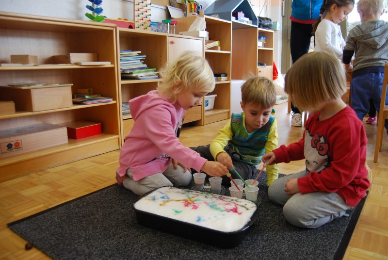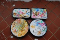Vreme nas je razveselilo z obilico snega, ki nam zadnje dni omogoča zimske radosti v obliki sankanja, oblikovanja snežakov, ustvarjanja sledi. Mi pa smo ga tokrat uporabili nekoliko drugače. Sneg smo v posodah prinesli v igralnico in s pomočjo barve in pipet smo ustvarili prave umetnine. Seveda smo jih razstavili na prostem, da so si jih bodo popoldne lahko ogledali še straši. Glede na napovedane zelo nizke temperature, ki nam bodo onemogočile izhod na prosto, se bomo podobnih dejavnosti posluževali še prihodnje dni.