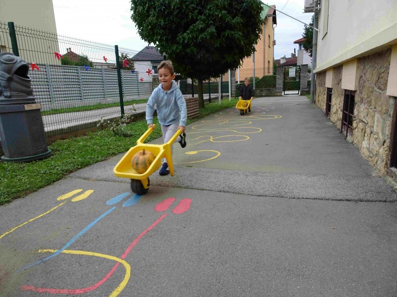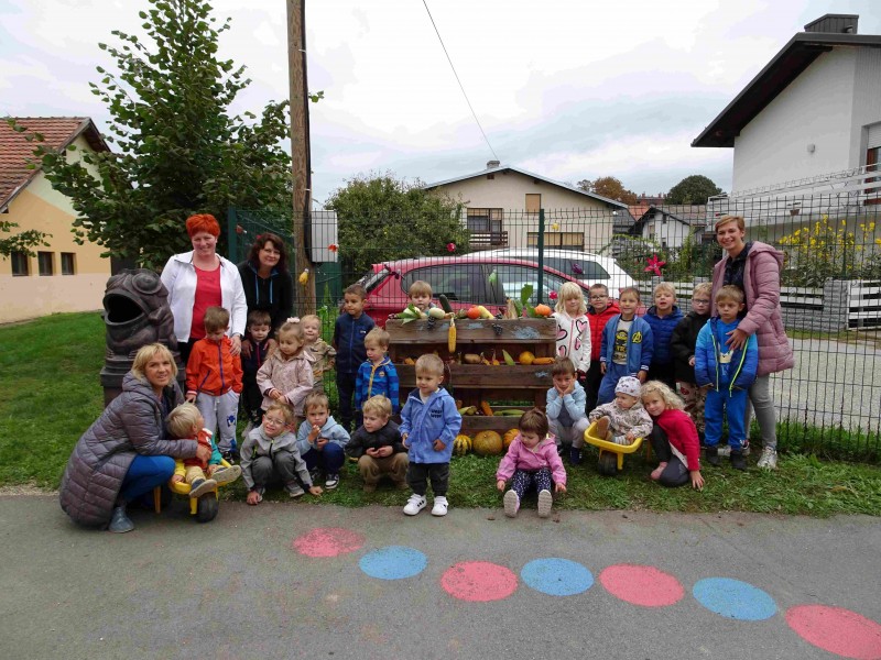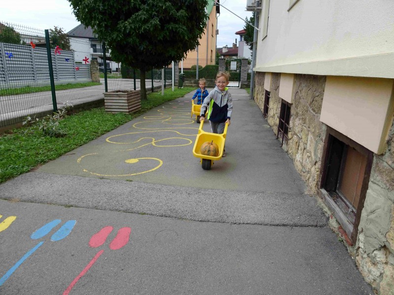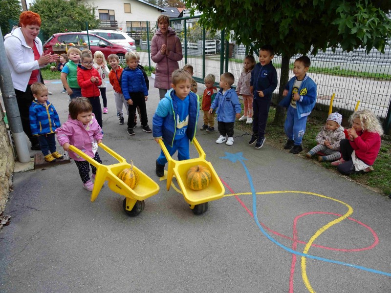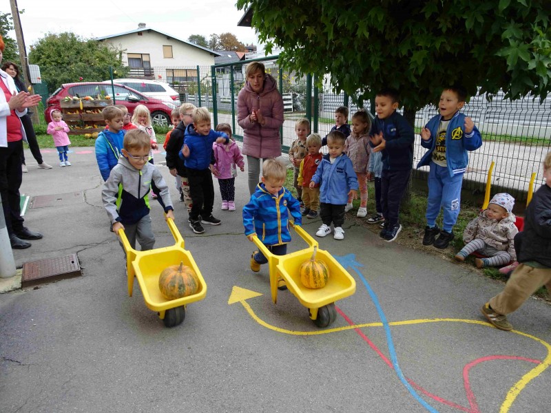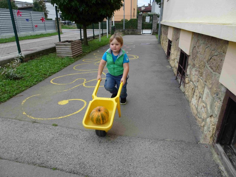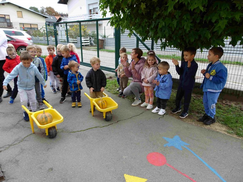 V naši enoti smo ustvari pravo jesenko dekoracijo. Otroci in vzgojiteljice smo okrasili dvorišče, vozili buče in prijatelje s samokolnicami, grabljali pisano listje in se ob tem neizmerno zabavali. S skupnimi močmi smo pričarali prijetno vzdušje jeseni.