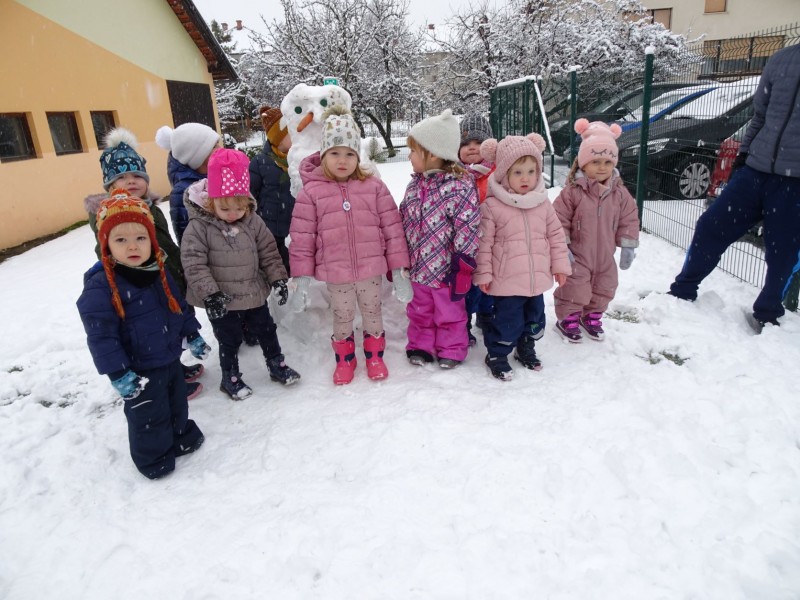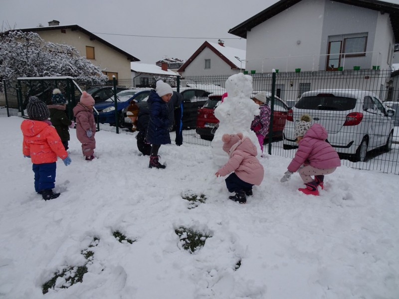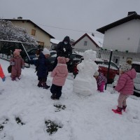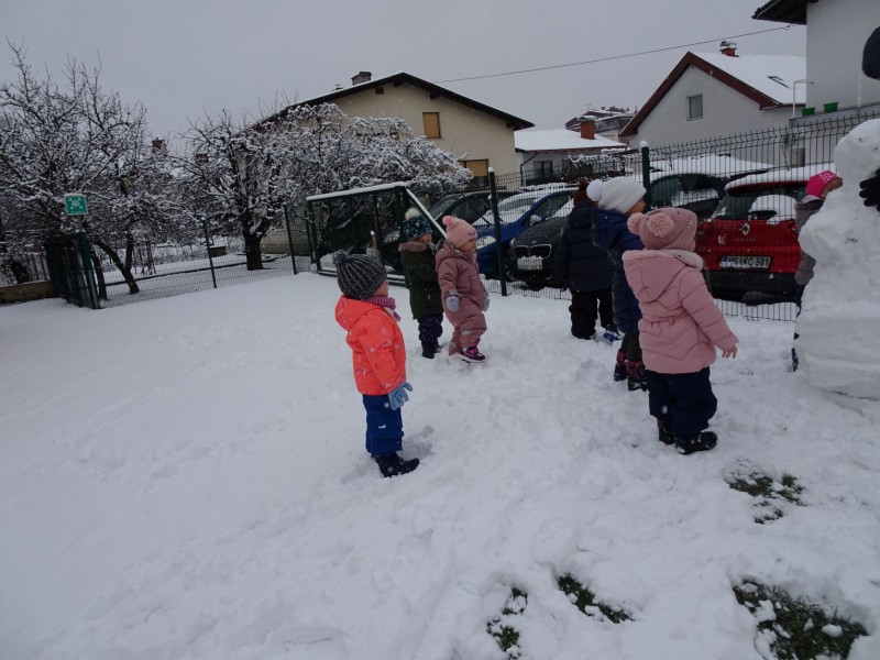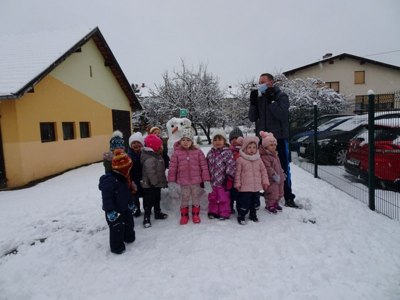 Danes smo se podali na vrtčevsko igrišče in po lovljenju na snegu, smo na noge postavili še znažaka.