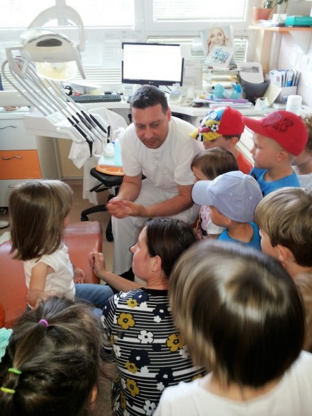 Tako pripravljeni smo potrkali na vrata ordinacije zobozdravnika. Prijazni zobozdravnik nam je pokazal nekaj svojih pripomočkov in stolček, ki ga poimenoval kar dvigalo. Pogumni otroci so prejeli štampiljke in pohvale. Prav vsi pa smo se strinjali, da je obisk zobozdravnika lahko tudi zelo zanimiv.