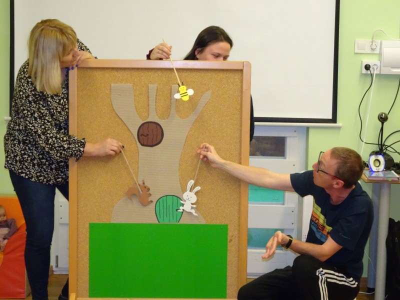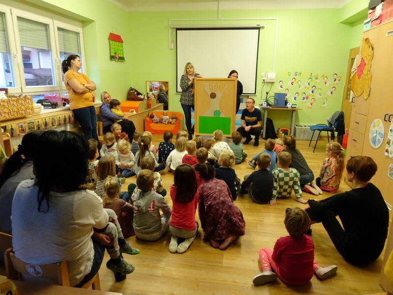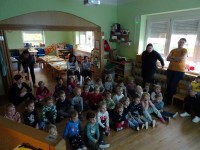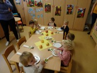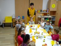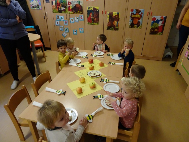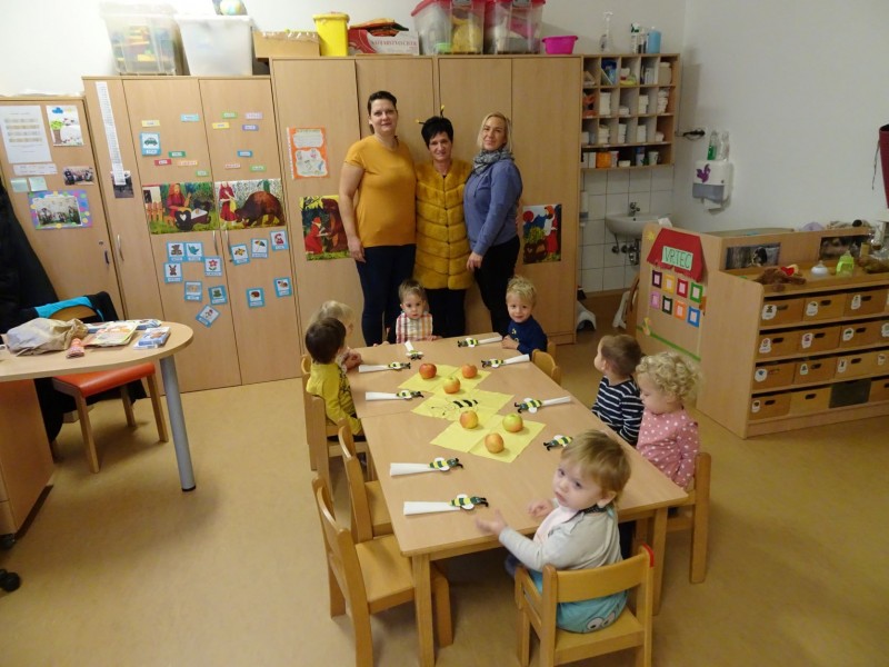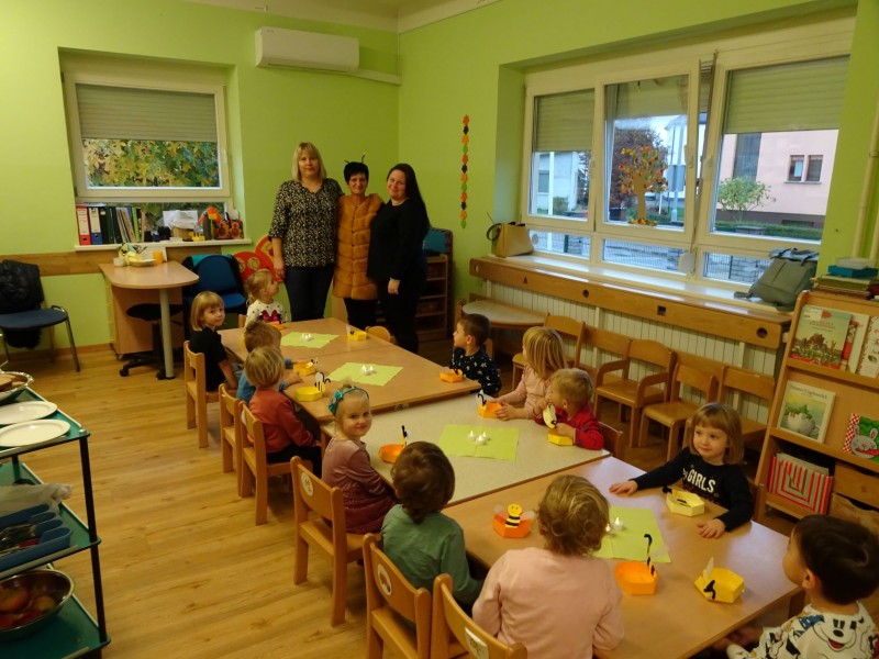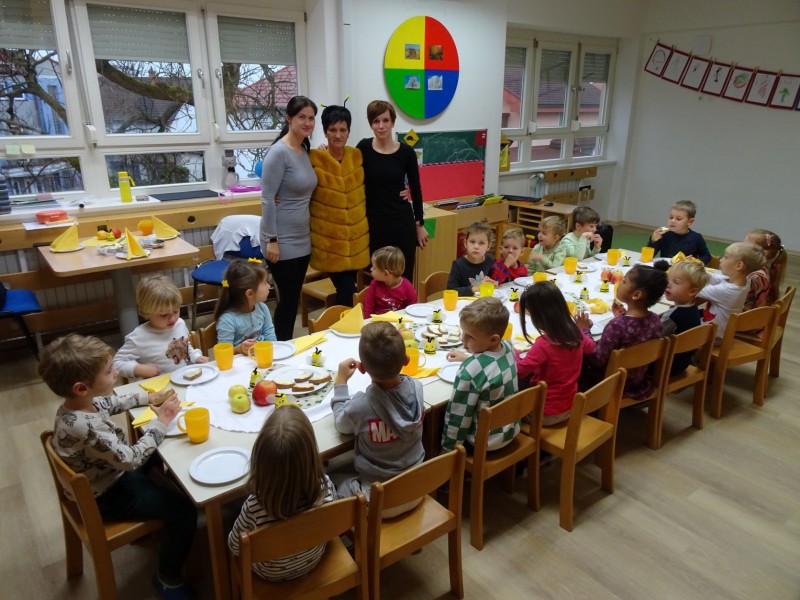 Današnji dan smo začeli malo drugače, kot je to ostale dni. Najprej smo si ogledali prispevek o hrani pridelani v Sloveniji, potem je sledila lutkovna predstava "Zajtrk pri živalih" in nato smo se odpravili v svoje igralnice, k mizam. Mize so bile posebej slavnostno okrašene, saj nam je danes zajtrk pripeljala čebelica.