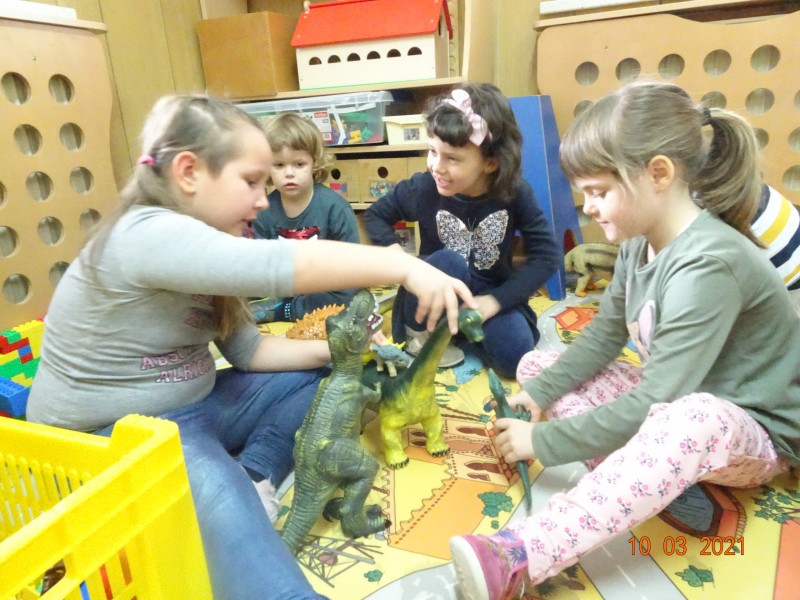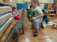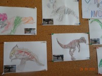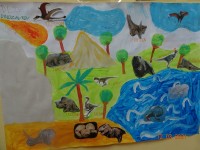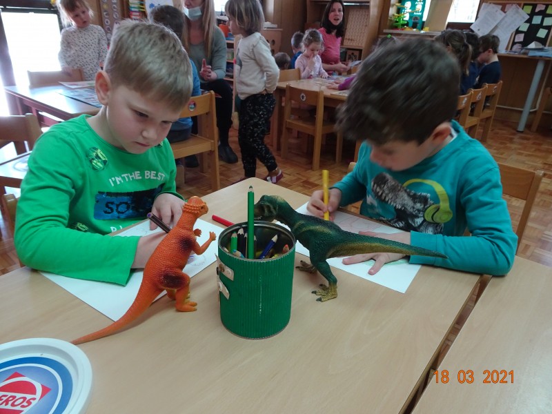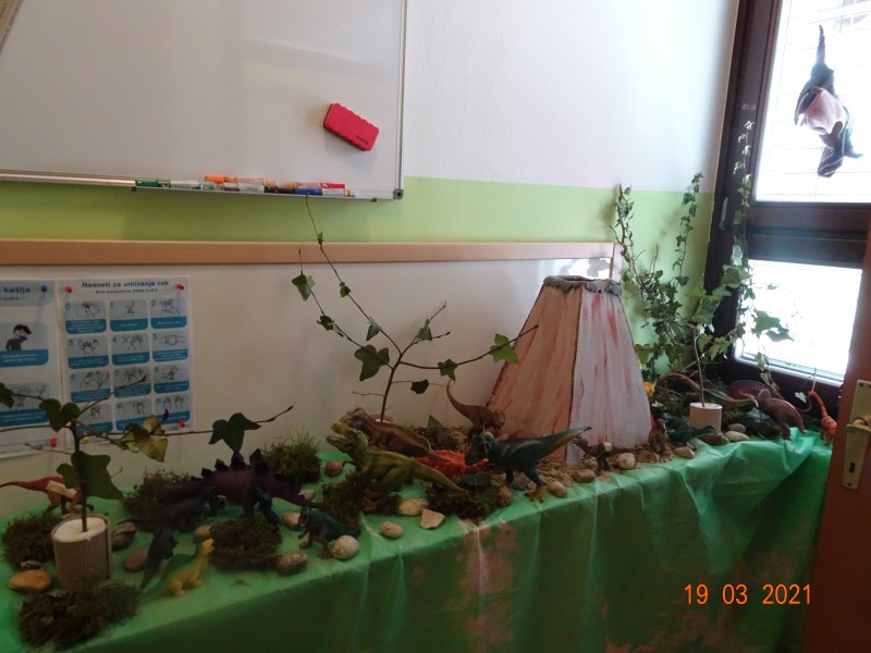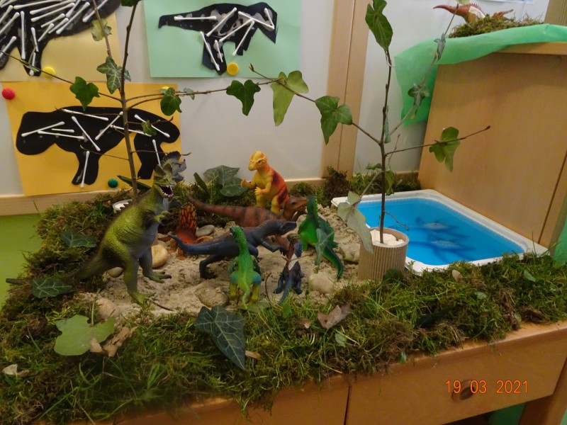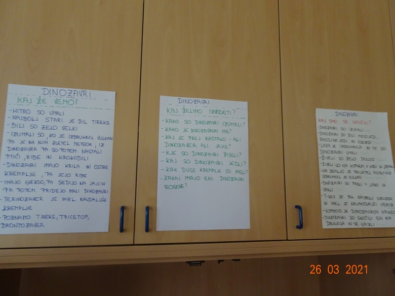 V našem primeru so otroci izzvali zanimanje za dinozavre in zato smo raziskali svet dinozavrov. Začeli smo z izdelavo plakata po tehniki KVL in sicer smo se najprej pogovorili kaj o dinozavrih že vemo, kaj se želimo naučiti in na koncu kaj smo se o dinozavrih naučili. Informacije o dinozavrih smo iskali v otroških enciklopedijah, knjigah in po spletu. Okostje dinozavrov smo si ogledali na svetlobni kocki, jih odtisovali v das maso, risali sence dinozavrov, izvedli poskus vulkana,… in še in še. Seveda pa ni manjkalo same igre z dinozavri, katerim smo z naravnim materialom naredili obliko njihovega domovanja. Glede na to, kje dinozavri živijo, s čim se prehranjujejo smo izdelali plakat ob koncu pa smo ustvarili pravo dinozavrovo deželo.