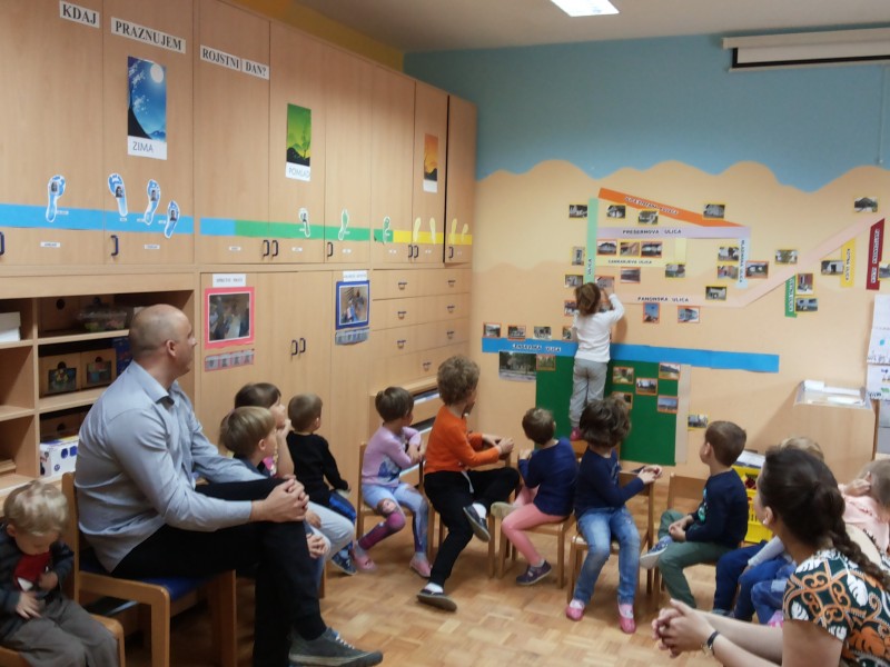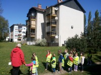 SPREHODILI SMO SE DO DOMA SLEHERNEGA ČLANA SKUPINE IN MED POTJO SREČEVALI RAZLIČNE ZGRADBE, PREBIVALCE NAŠEGA KRAJA , TER SI OGLEDALI ŽIVO IN NEŽIVO NARAVO. OTROCI SO IMELI MOŽNOST S PONUJENIM LIKOVNIM MATERIALOM PODOŽIVETI SPREHOD PO DOMAČEM KRAJU IN UPODOBITI VIDENO.