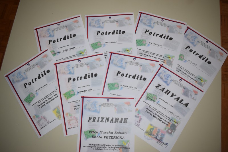 Vrtec Murska Sobota z enoto Veverička je prejel priznanje za najaktivnejši vrtec na področju informiranja in usposabljanja za osebno in vzajemno zaščito.