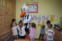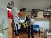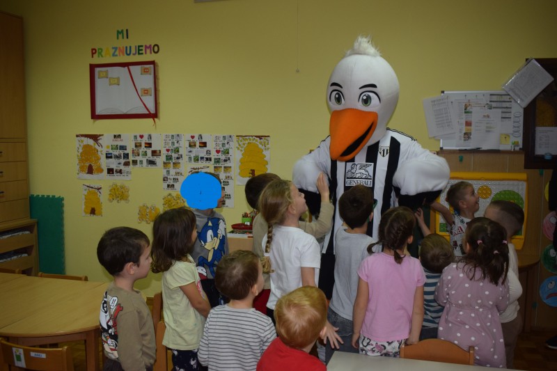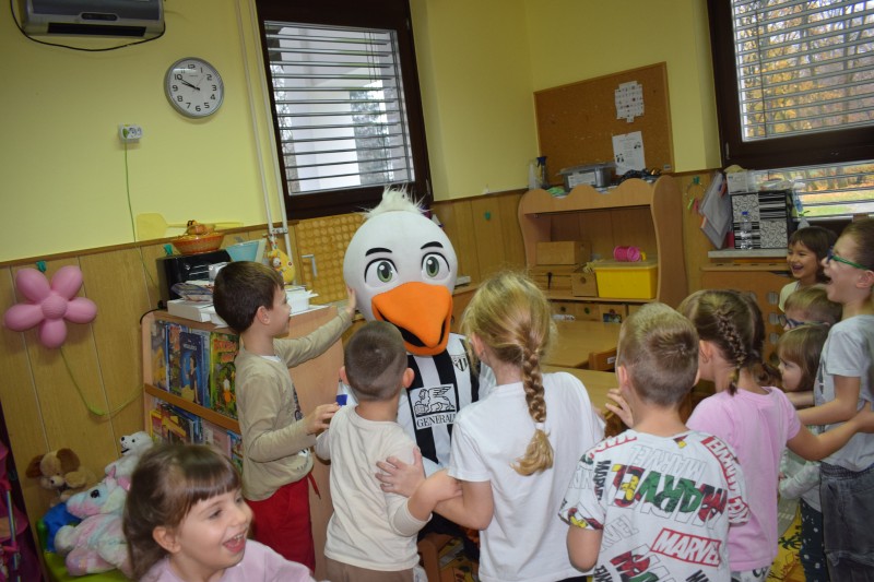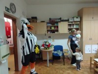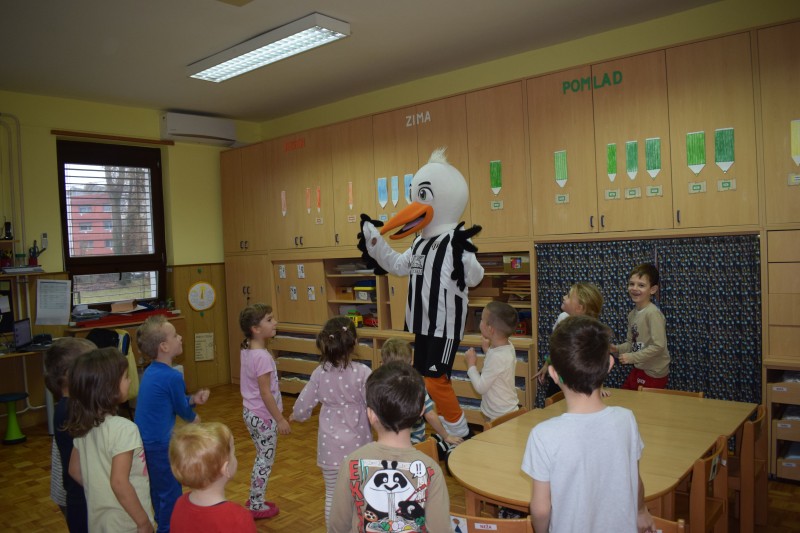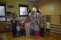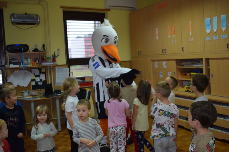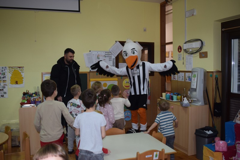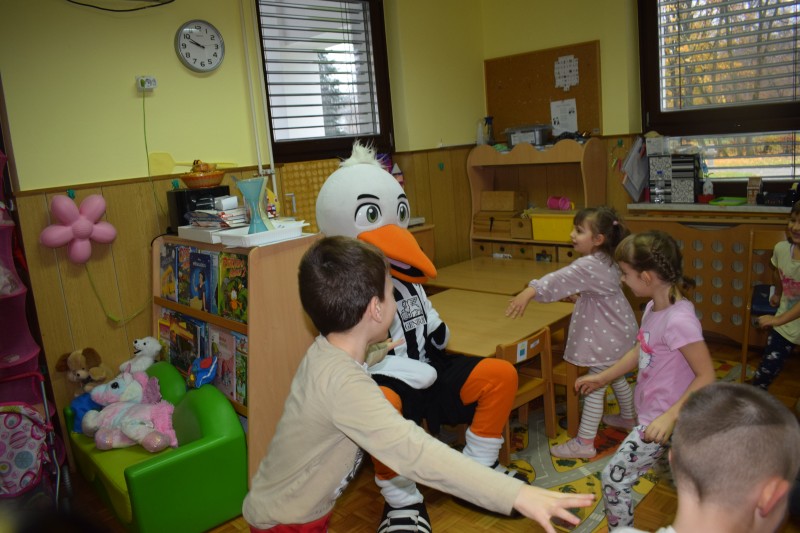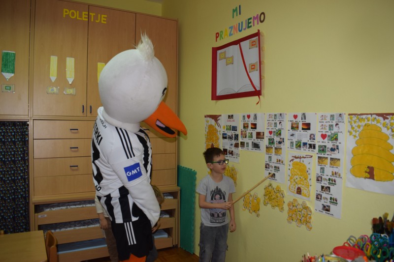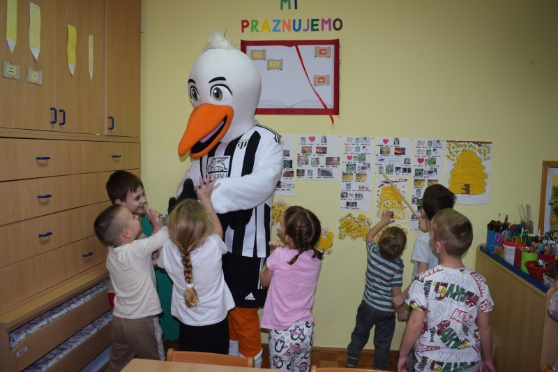 V našem vrtcu smo imeli prav poseben obisk – obiskal nas je Štrki iz nogometnega kluba NŠ Mura. Otroci so ga z navdušenjem pričakali, skupaj smo mu zapeli pesem Čebelar, potem pa se z njim zabavali.