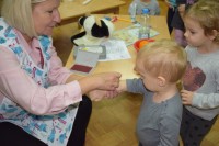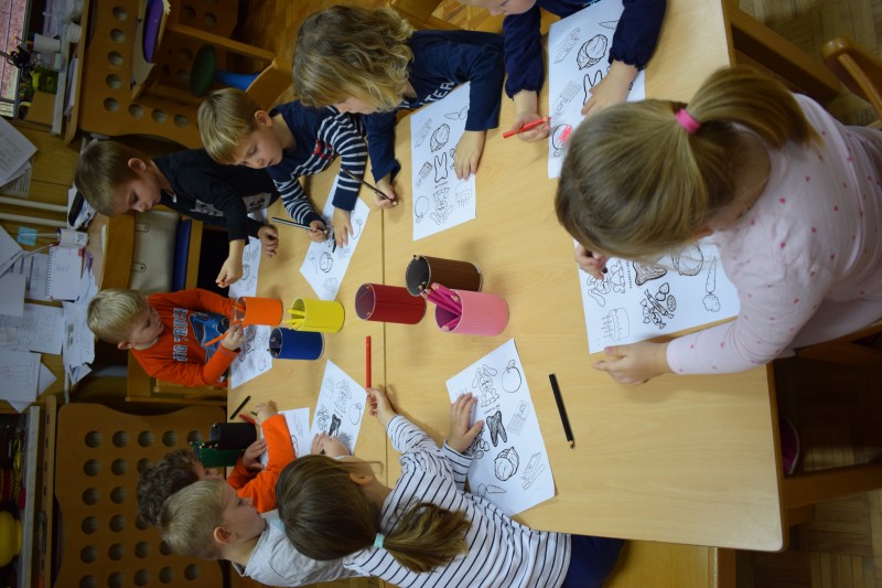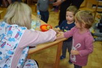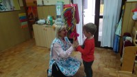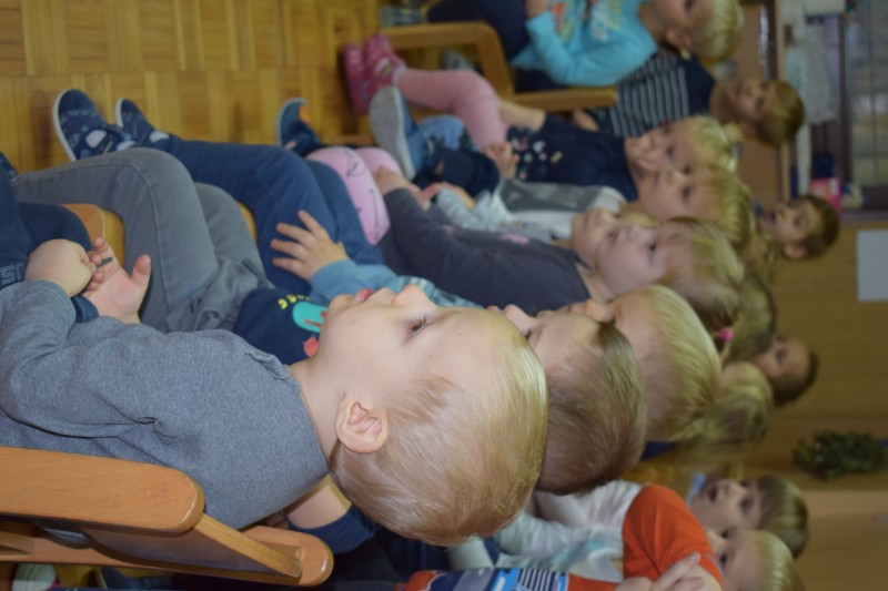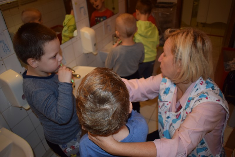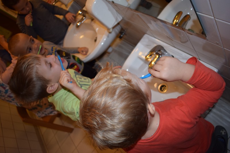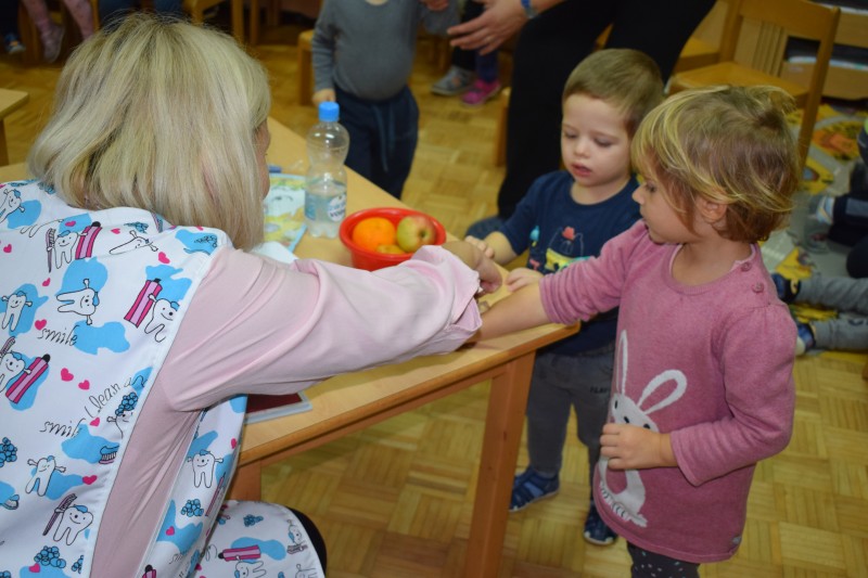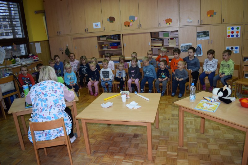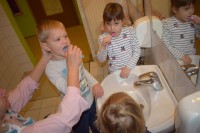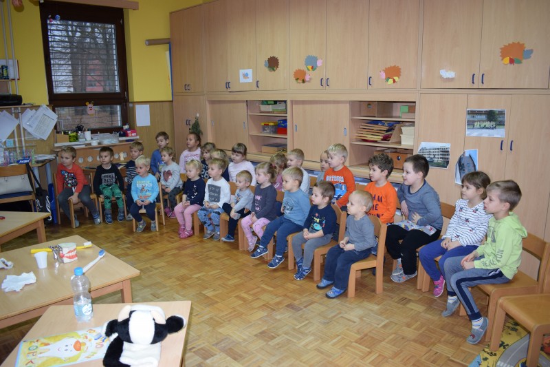 Ker v vrtcu skrbimo za vsakodnevno ščetkanje zob, nas je v ta namen obiskala zobna asistentka Maja. Predstavila nam je poučno zgodbo z lutkami o zdravi prehrani in čistih zobeh. Individualno je otrokom pokazala, kako se pravilno ščetkajo zobje. Dobili smo tudi nalogo, da pobarvamo in prečrtamo nezdravo prehrano.