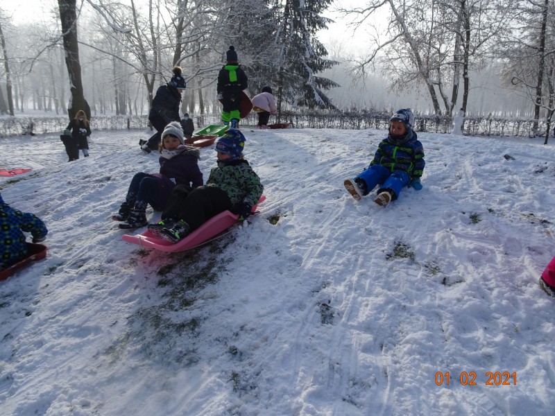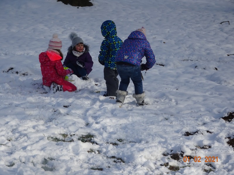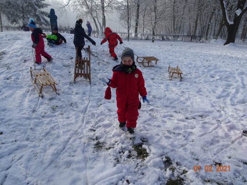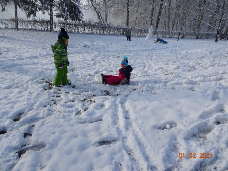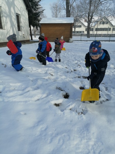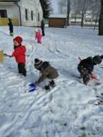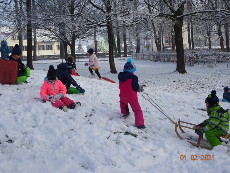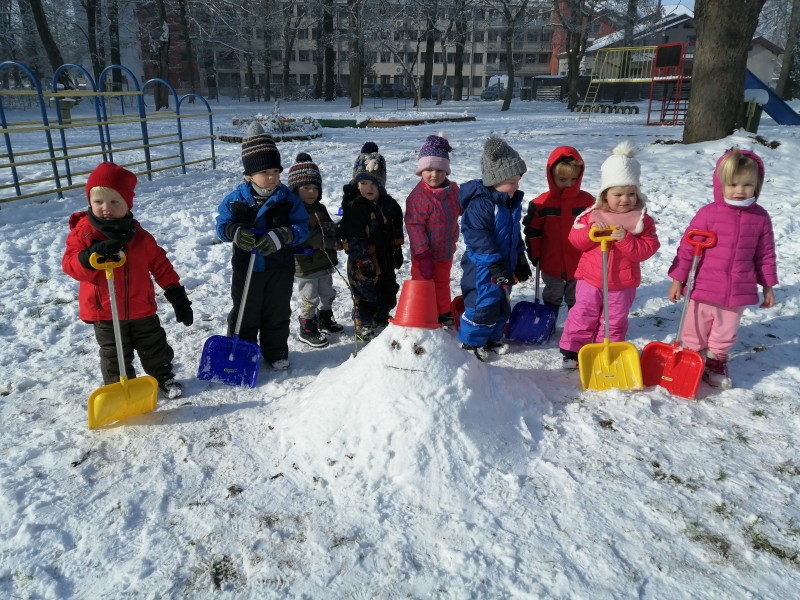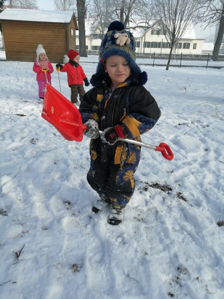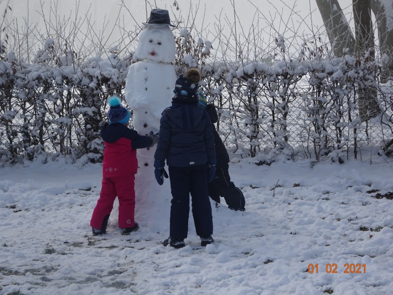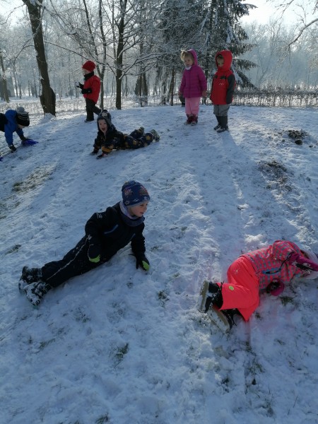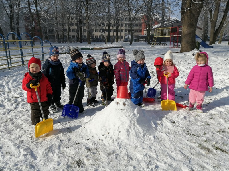 Sneg je tu in lička vsa so rdeča. Danes pa nam je za vrat še padla kakšna kepa. Sneg je razveselil otroke, saj so dopoldne preživeli zunaj na snegu. Vzdušje je bilo razigrano in veselo. Kepali smo se, sankali, kotalili, naredili pa tudi sneženega moža.