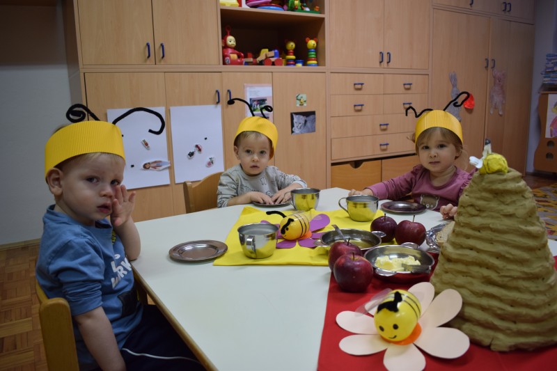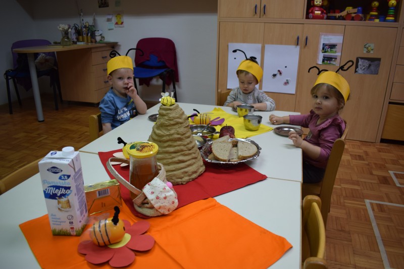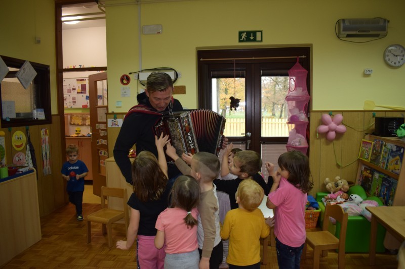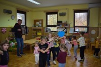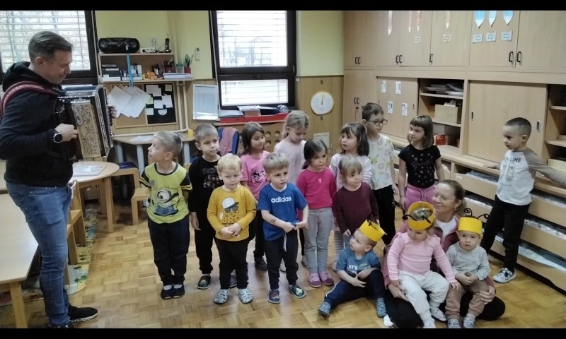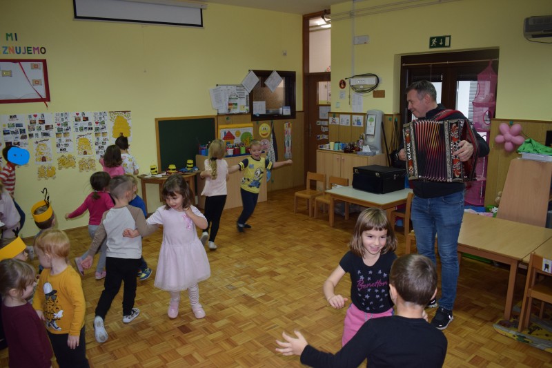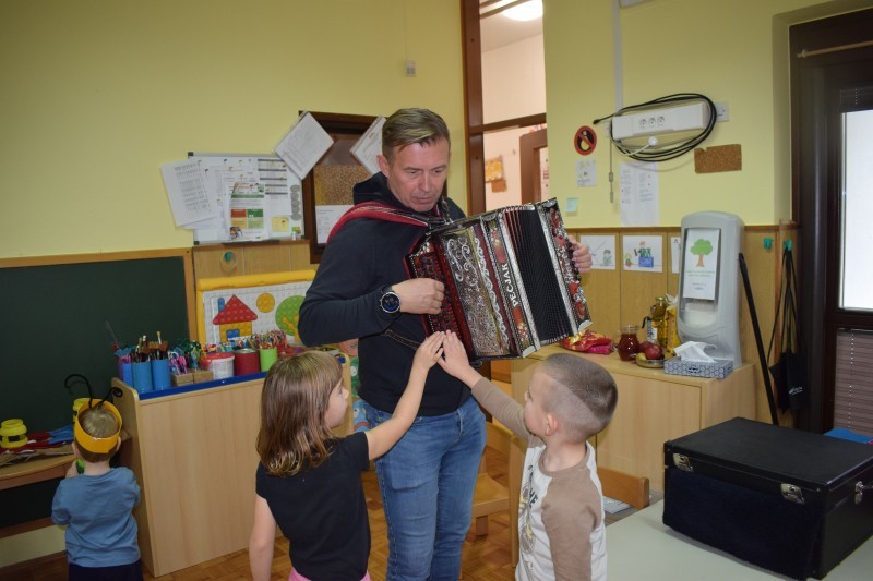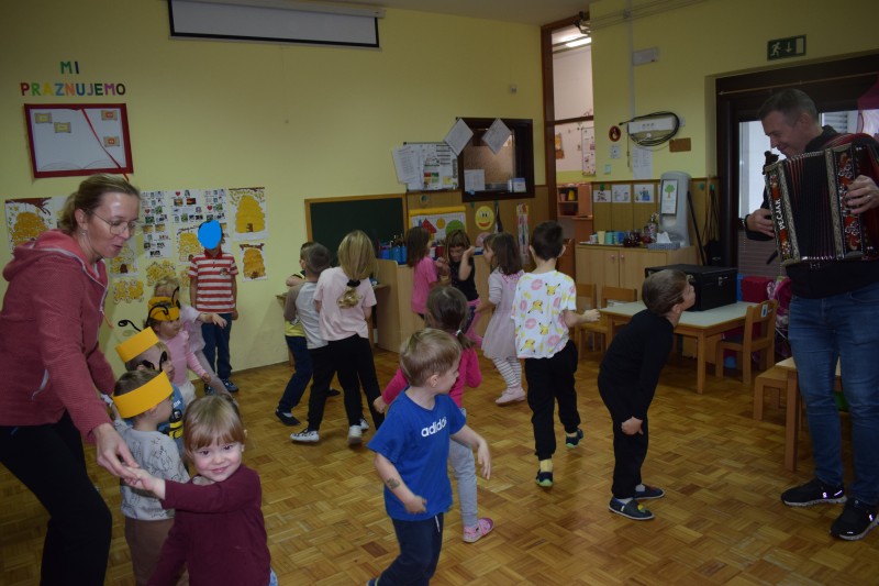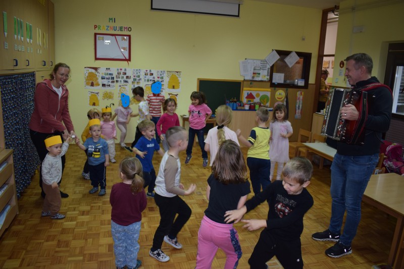 Skupaj smo zapeli pesem “Čebelar", pri tem pa nas je s harmoniko spremljal harmonikar Bojan, ki je ustvaril prijetno in veselo vzdušje. Otroci so glasbo z navdušenjem sprejeli, zato smo ob njegovem igranju še zapeli in zaplesali ter se tako sproščeno povezali.