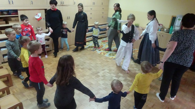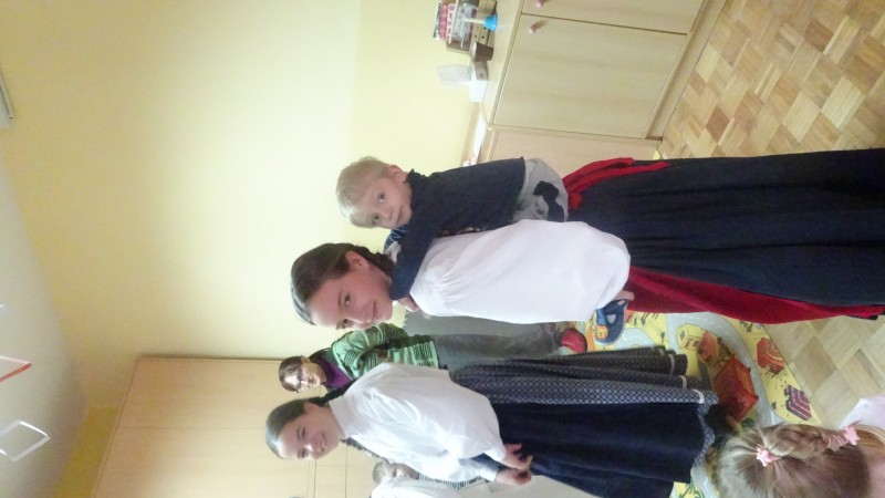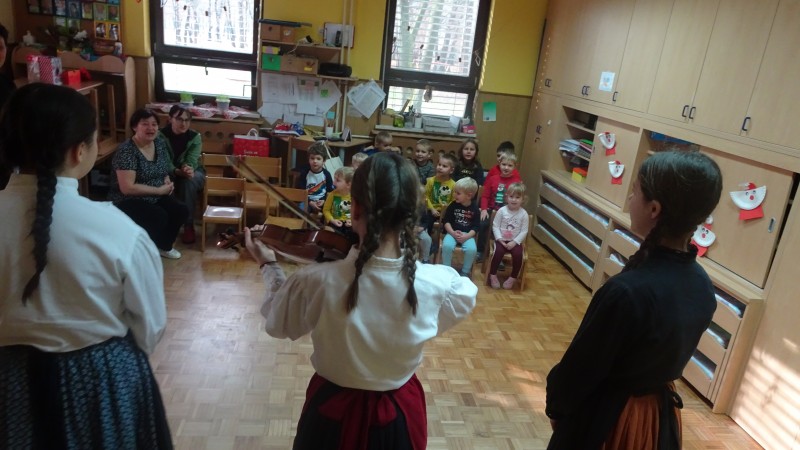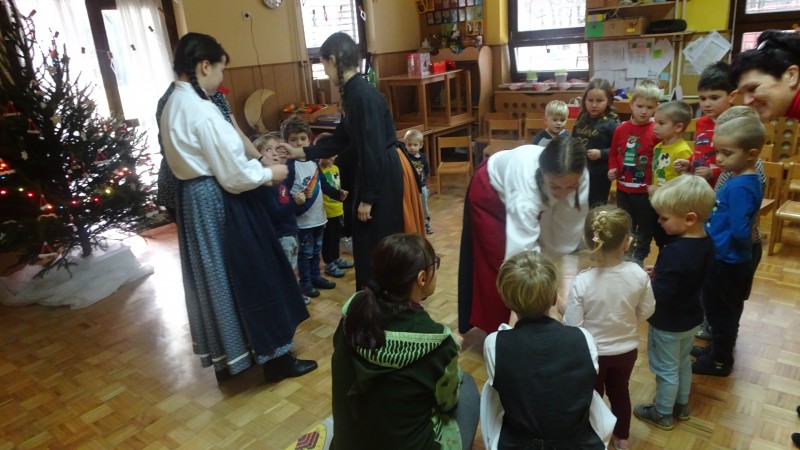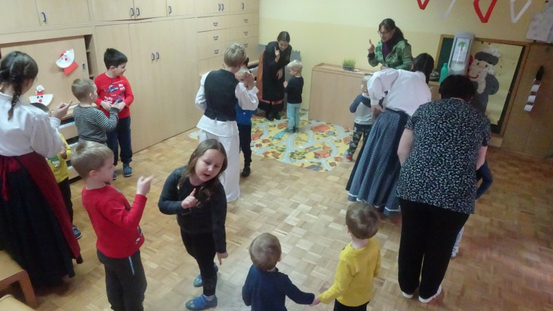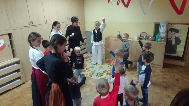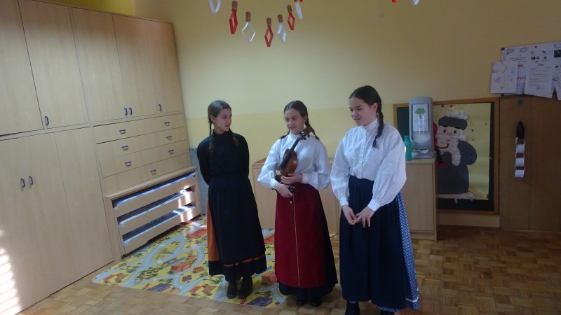 Pod vodstvom učiteljice, ga. Jelke Breznik, so se nam predstavili folkloristi OŠ Beltinci. Skozi igre, ples, petje in šege smo spoznali, kako so se naši dedki in babice igrali, družili nekoč.