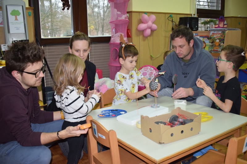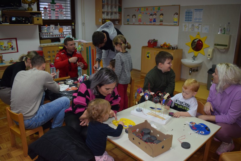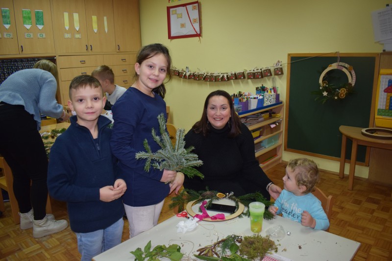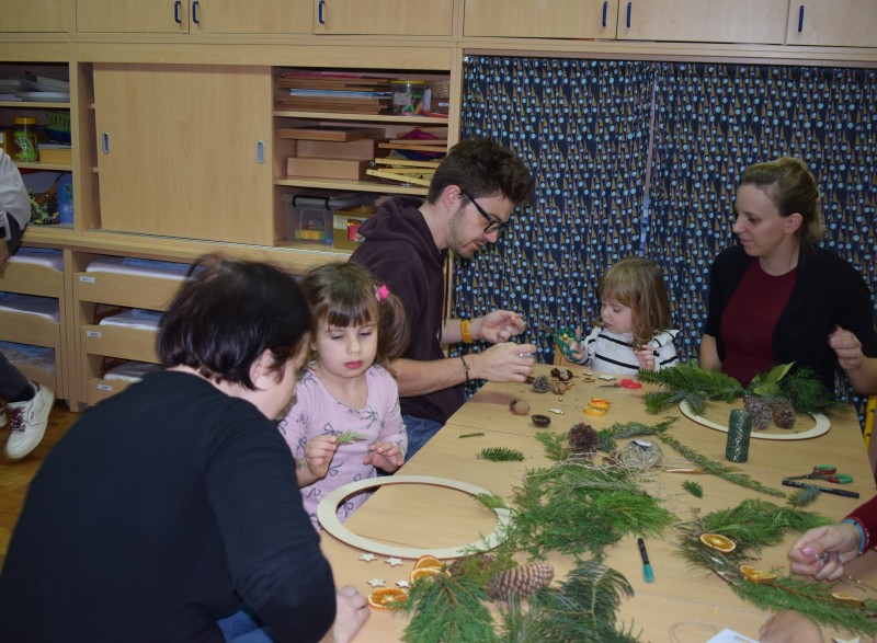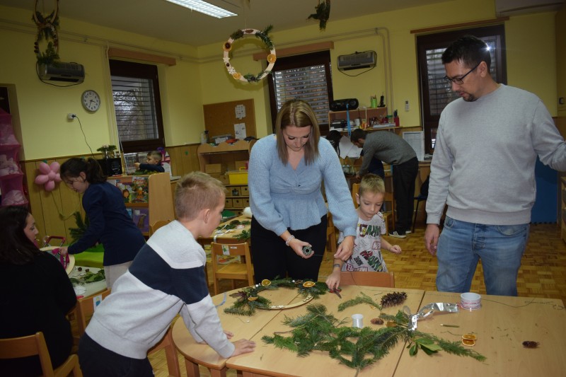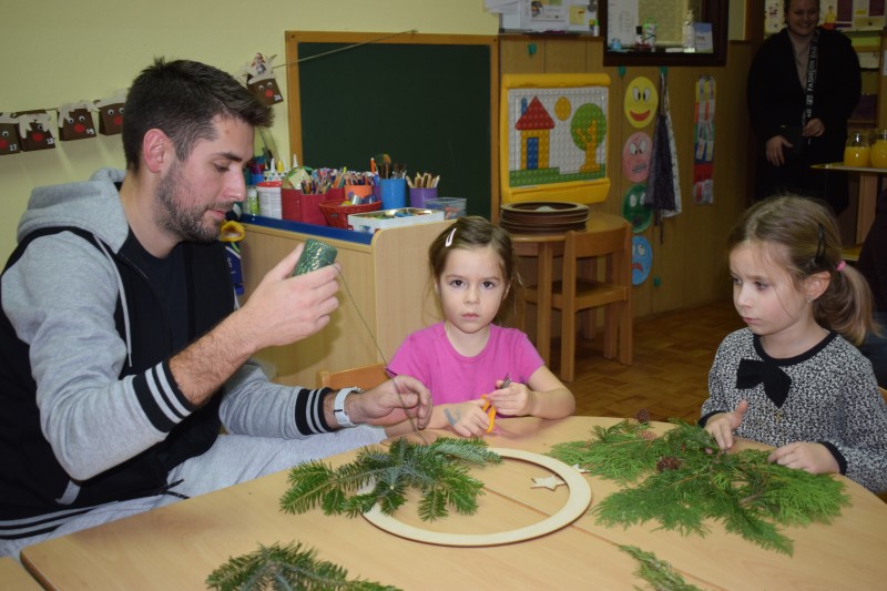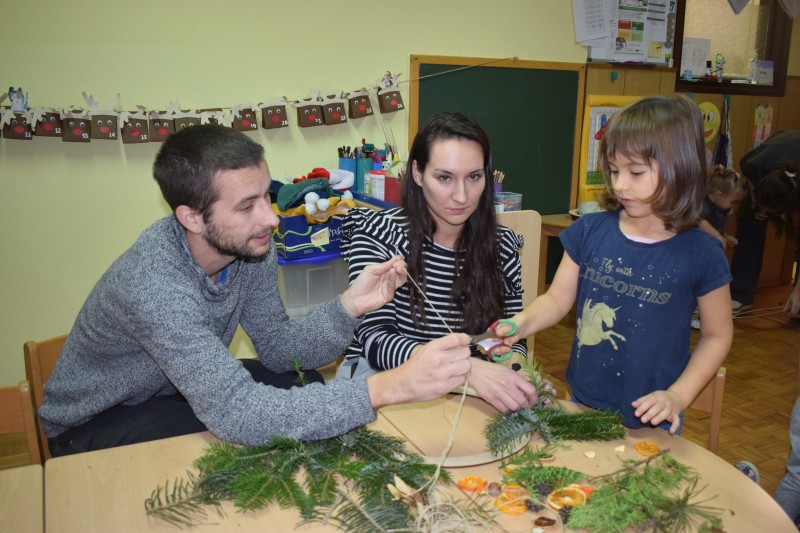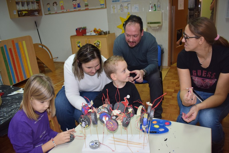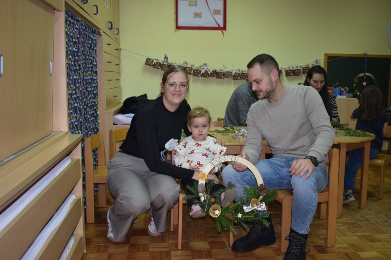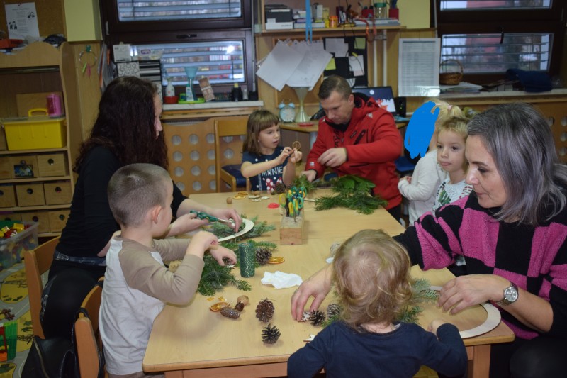 Otroci in starši so s skupnimi močmi izdelovali okraske za novoletno jelko ter dekoracijo za naše prostore. Nastali so mnogi domiselni izdelki, ki že krasijo vrtec in vnašajo praznično vzdušje.