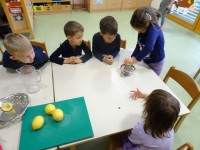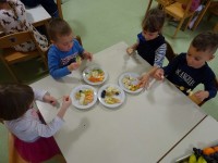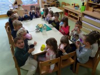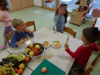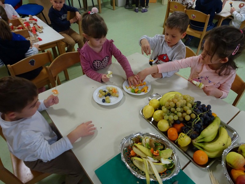 V naši skupini smo se v preteklih dneh veliko pogovarjali o tem, kako lahko z zdravim načinom življenja poskrbimo za dobro počutje. Skupaj z otroki, starimi 4–5 let, smo raziskovali pomen zdrave prehrane, rednega gibanja in skrbi za osebno higieno. Otroci so z velikim zanimanjem spoznavali različna živila ter skupaj razmišljali, katera od njih nam dajejo energijo in nas ohranjajo zdrave. Najbolj pa so uživali pri pripravi sadnih nabodal, sadnih “bonbonov” in osvežilne domače limonade. Pri tem smo spodbujali medsebojno sodelovanje, pogum pri okušanju novih okusov ter razvijali ročne spretnosti.