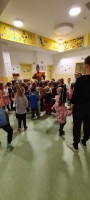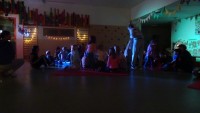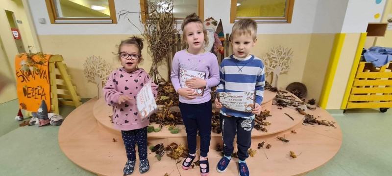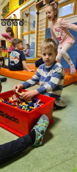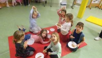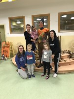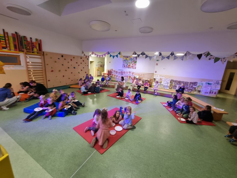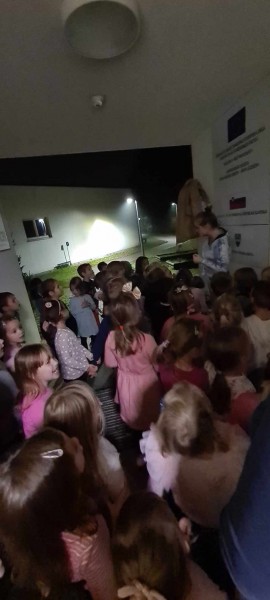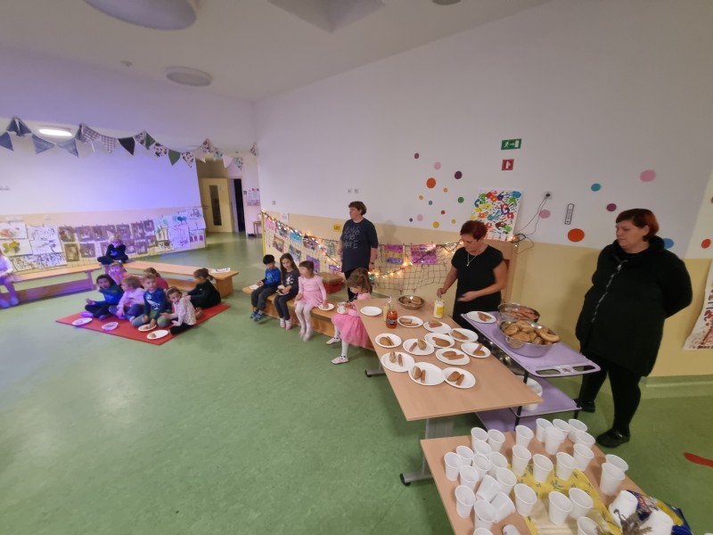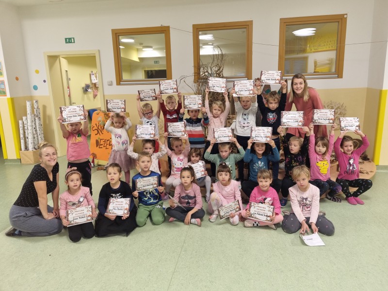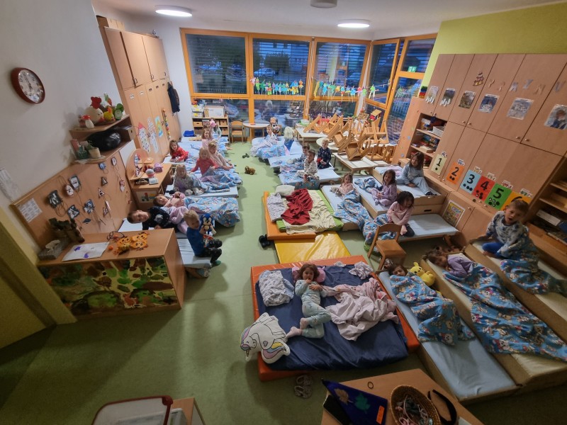 Nočitev v vrtcu je res nekaj posebnega. Ne samo, da nekateri otroci prvič prespijo v družbi prijateljev, ampak tudi da zberejo pogum za prenočitev brez bližine staršev. V okviru nadstandardne dejavnosti smo otroke strokovne delavke sprejele v mističnem ambientu, ki smo ga poimenovali "Škratova dežela'' (glasba, lučke, okrasitev, pripravljeni igralni kotički, plesišče, miza s toplim čajem in prigrizki). Po branju pisma smo se s svetilkami odpravili okrog vrtca, kjer smo pod hrastovo krošnjo zasačili škrata, ki je izvajal obredni ples ob ognjišču. V prijetni družbi smo poklepetali o dogodivščinah in zapeli nekaj pesmic. Sledilo je iskanje zaklada, ki je bil "pika na i" večera (skrita škratova vreča presenečenja). Po večerji smo se še malo družili v umirjenem okolju, delili doživetja ter se kmalu zatem pripravili na spanje. Jutranje veselje je bilo neopisljivo. Otroci so se prespane noči zelo razveselili ter bili ponosni ob podelitvi diplom. Po zajtrku so v razposajenem vzdušju pričakali svoje starše.